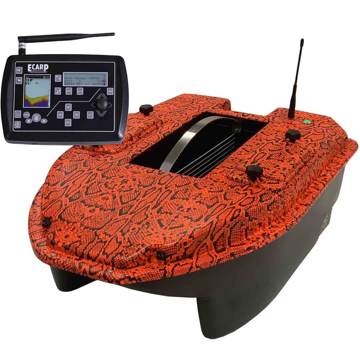 Barco Cebador Carpio C3 con Sonda a Color, GPS y Bolsa de Transporte Camo Serpiente Naranja – Potencia, Tecnología y Precisión para el Carpfishing Moderno