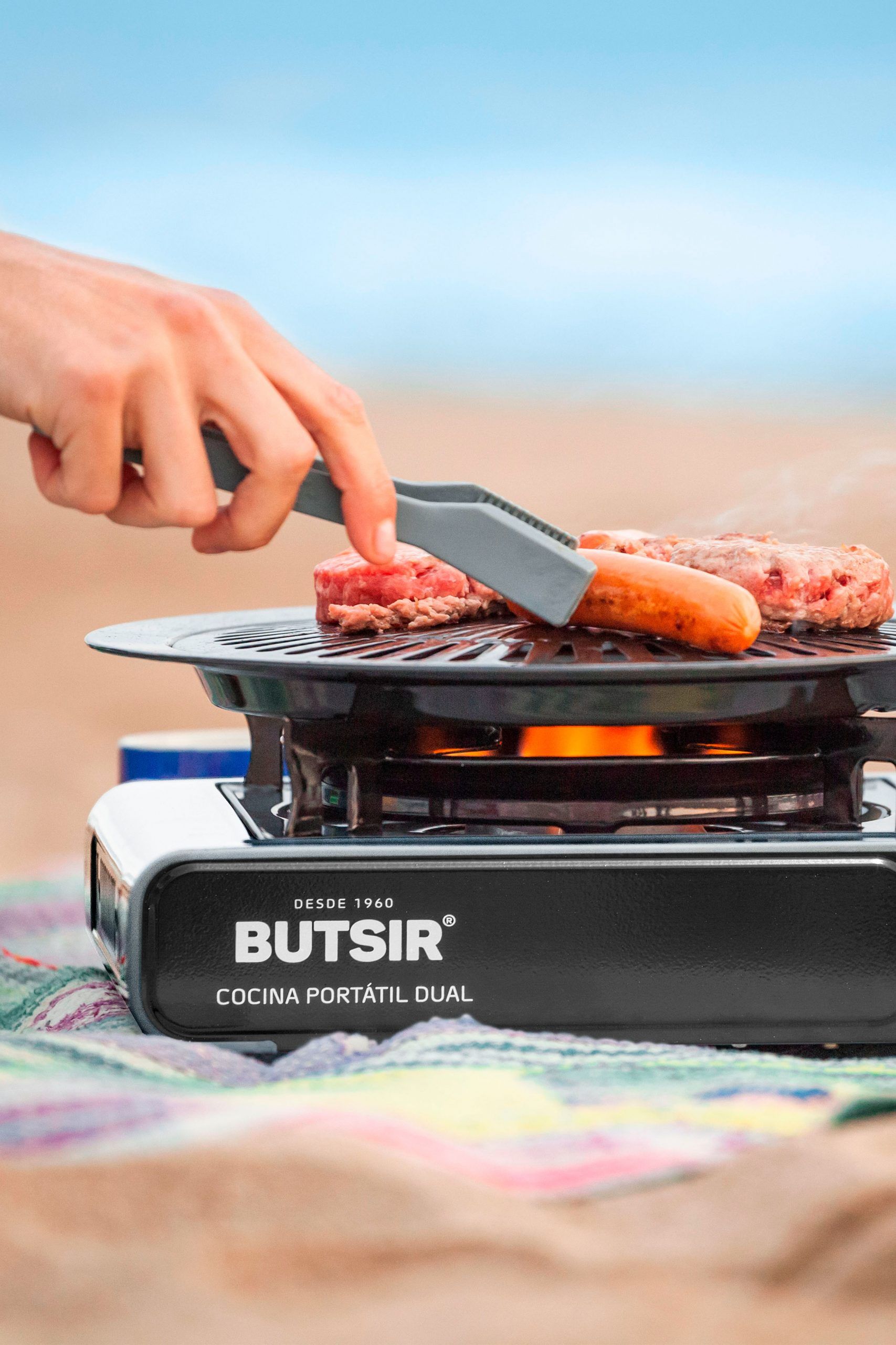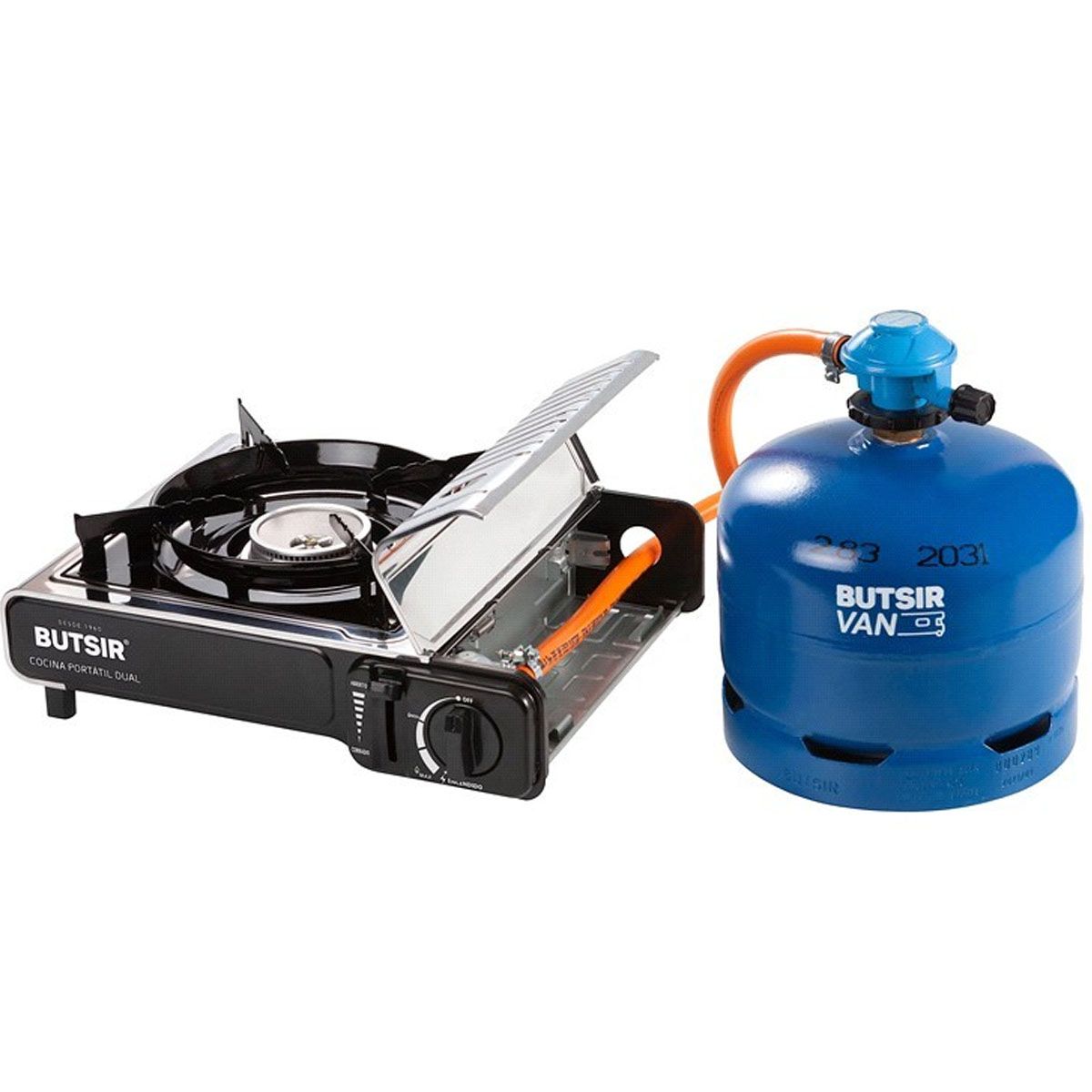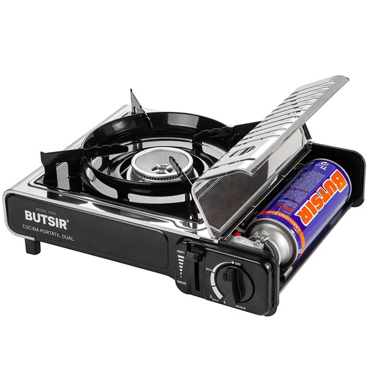 Práctico fogón portátil Butsir MS-2000 DUAL puede utilizarse con cartuchos de gas 250 de válvula y con bombonas de gas (como la de la foto). Aporta una gran flexibilidad al permitir este uso Dual, utilizar cartucho de válvula para cocinar o calentar algo rápido o para un uso más habitual montar la bombona de camping y no gastar tantos cartuchos. Ahora fabricada con cuerpo en acero inoxidable y parrilla esmaltada. Homologada según la nueva normativa CE EN17476/2021 para más seguridad.