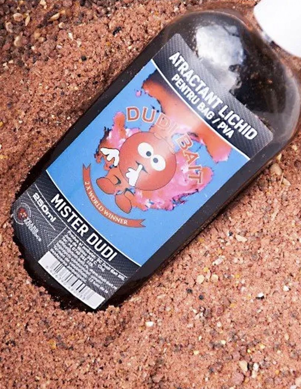 1 botella de 250 ml de atrayente líquido PVA “Mister Dudi”, un líquido de gran eficacia derivado de la receta utilizada para fabricar los boilies Mister Dudi. A este líquido se le añaden componentes especiales que intensifican la atracción, generando señales químicas en el agua que incitan a las carpas a buscar su fuente y a alimentarse activamente.