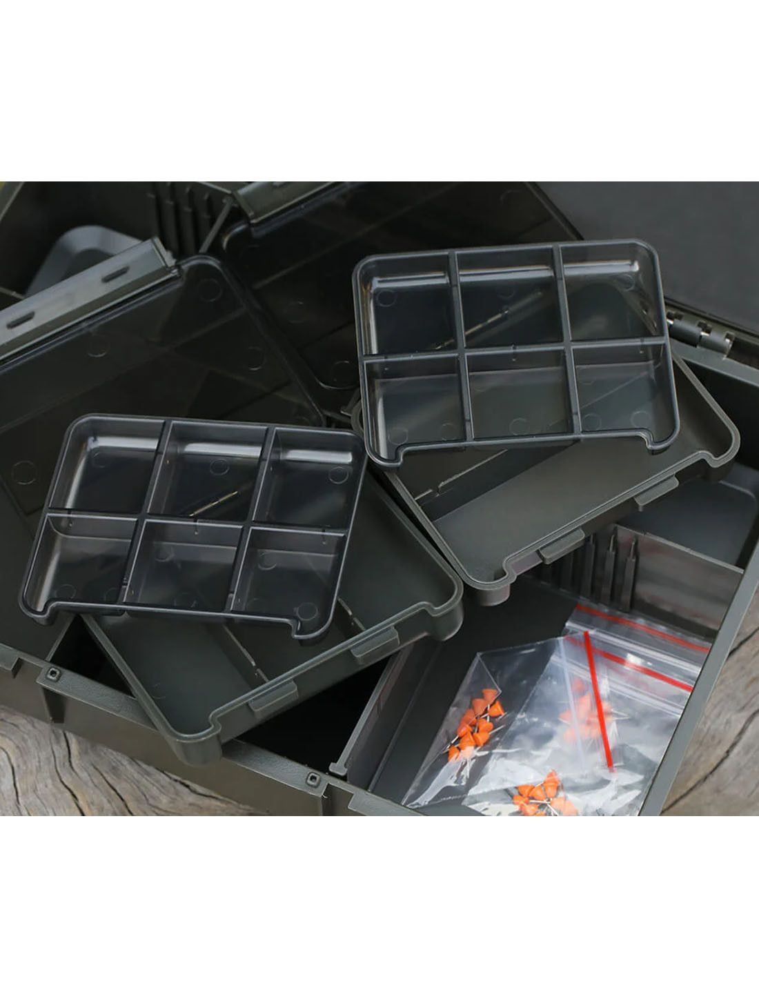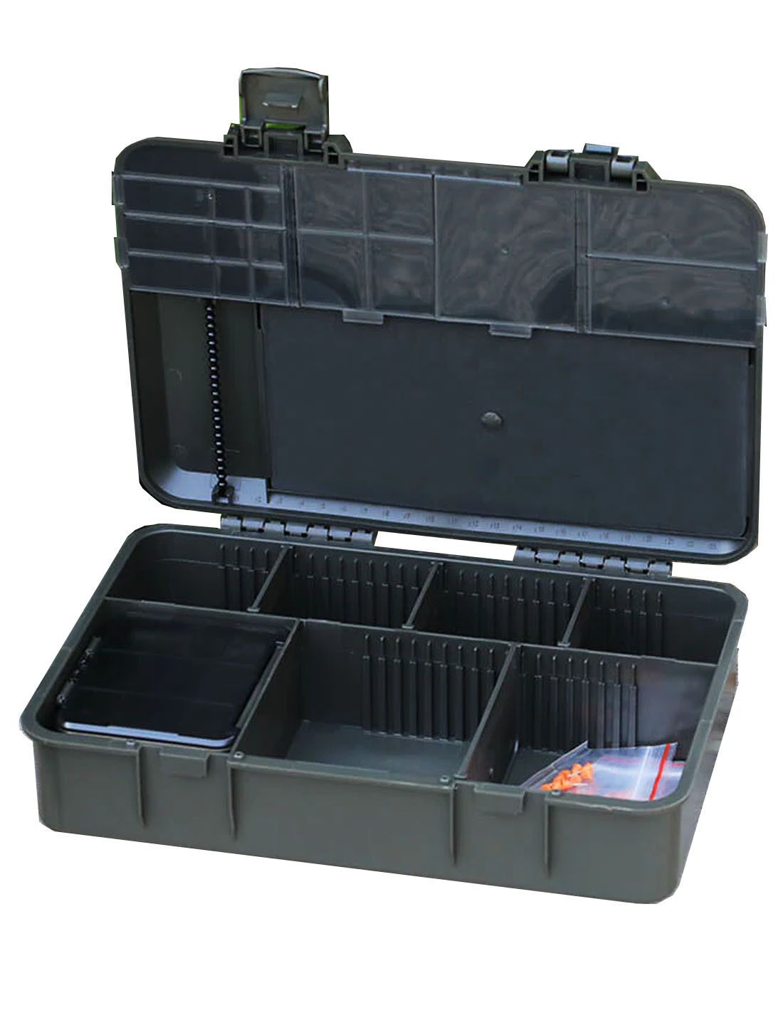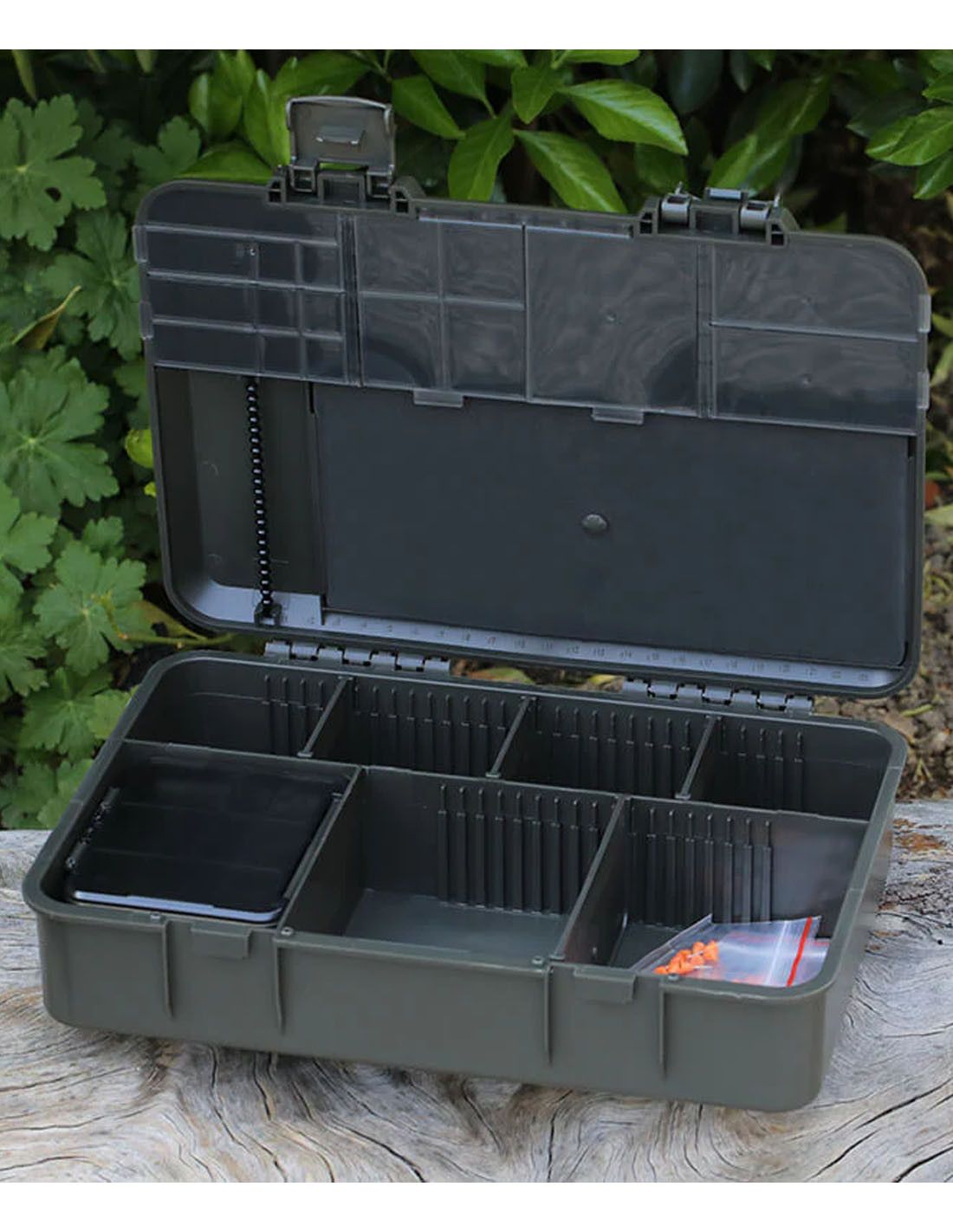Fabricada con materiales de gran durabilidad, esta caja cuenta con un sistema de cierre doble mediante pestañas de bloqueo, lo que garantiza que el contenido permanezca seguro en todo momento. Gracias a su resistencia, soporta sin problemas el uso intensivo en cada jornada de pesca.