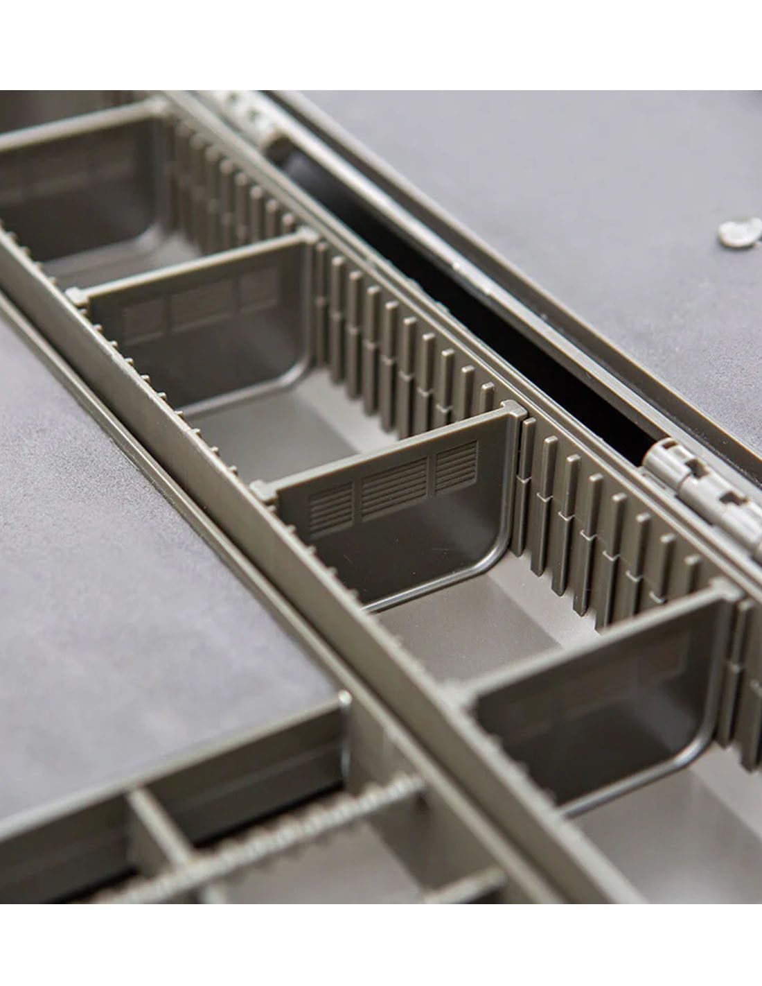 Para mayor versatilidad, se incluye un tablero extraíble capaz de almacenar hasta 20 aparejos adicionales. El compartimento principal ofrece aún más posibilidades gracias a sus 4 divisores ajustables, que permiten organizar el equipo según las necesidades de cada pescador.