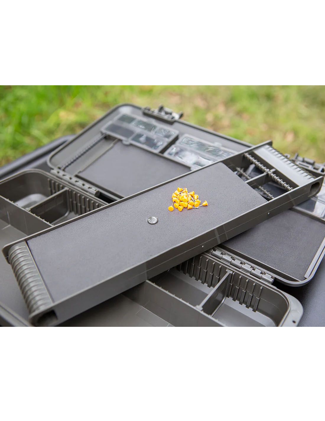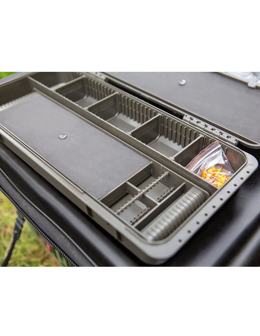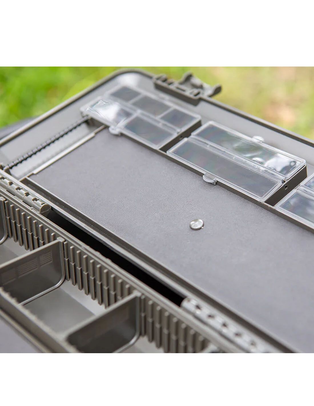 La tapa cuenta con 13 compartimentos de almacenamiento, ideales para accesorios pequeños. También integra un tablero de aparejos fijo con capacidad para hasta 16 montajes ya preparados, lo que facilita tenerlos siempre listos para su uso inmediato.