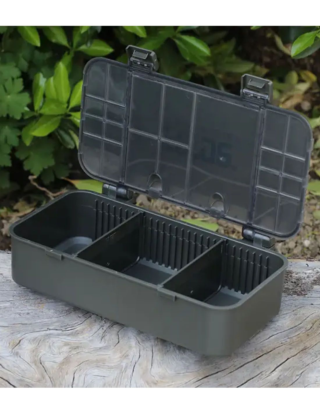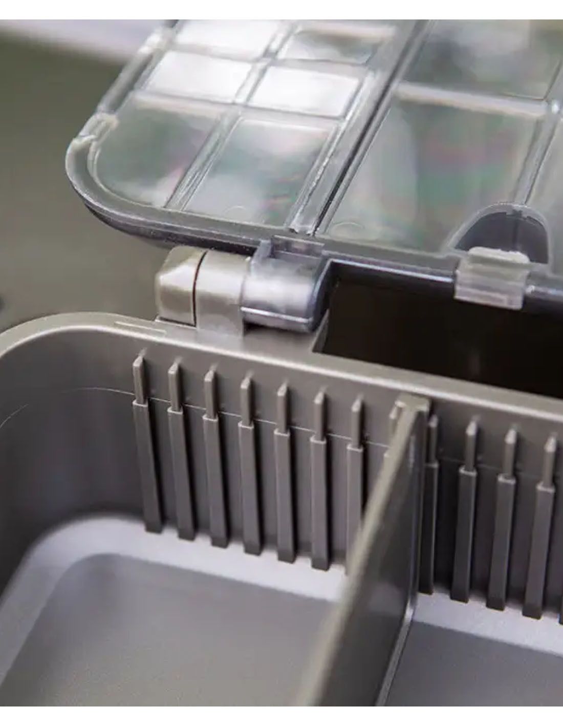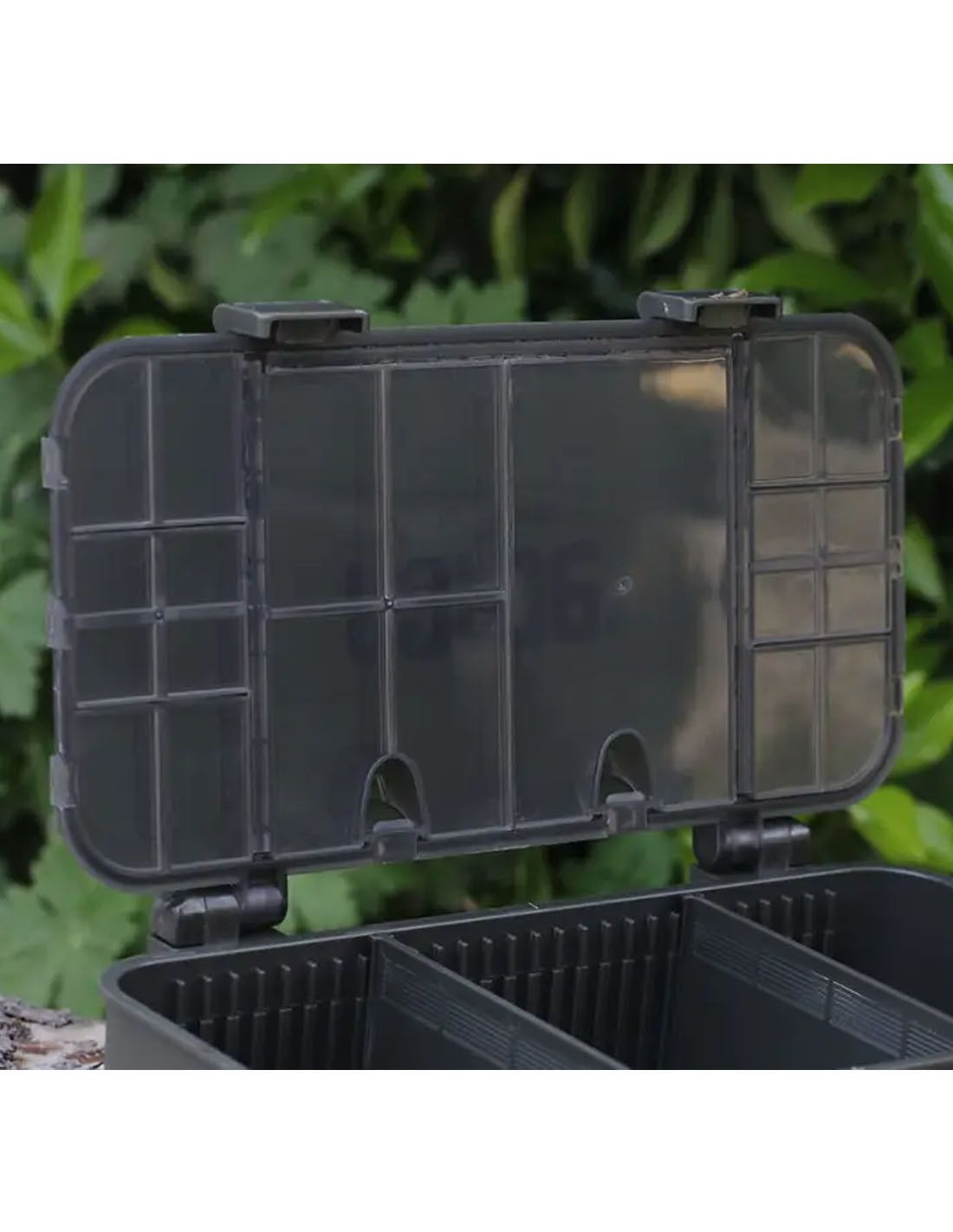 El diseño de la Tactical Box 2 combina versatilidad y eficiencia. En la tapa, cuenta con 21 compartimentos individuales, ideales para organizar anzuelos, micro-tubos, perlas, terminales o cualquier pequeño accesorio que requiera un acceso rápido y ordenado. Esto permite al pescador localizar lo que necesita al instante, evitando pérdida de tiempo y frustración durante la sesión de pesca. Además, la base incluye un compartimento grande con dos divisores ajustables, ofreciendo la flexibilidad necesaria para almacenar señuelos más voluminosos, líneas, plomos o cualquier otro accesorio que no quepa en los compartimentos pequeños.