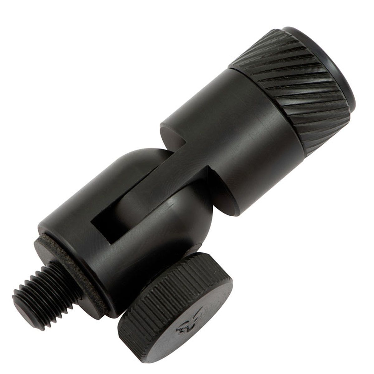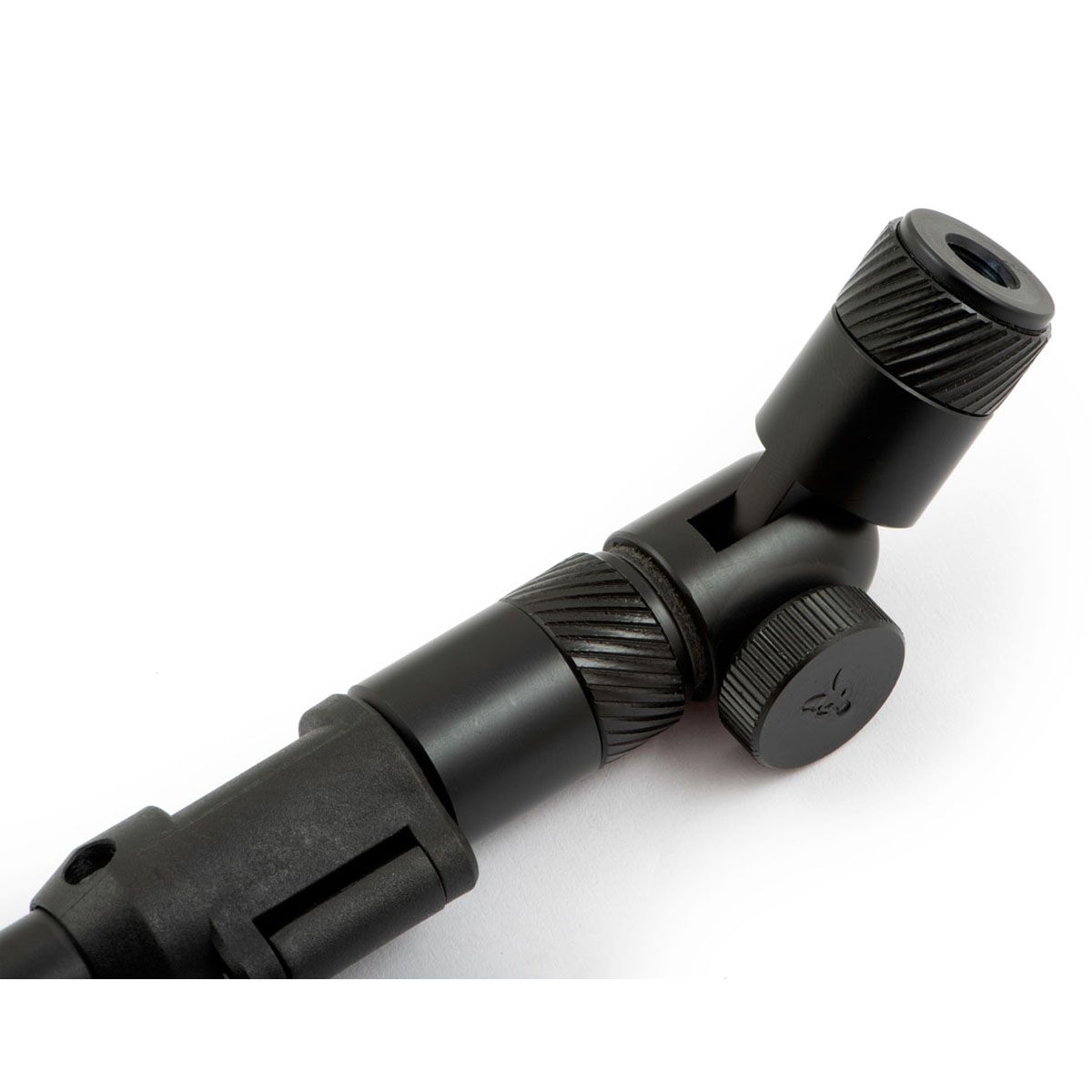 El nuevo adaptador angular cuenta con el sistema QR para aceptar una alarma o un apoyo trasero en la mitad superior y una rosca en la mitad inferior para permitir su uso con ambos tipos de pértigas.