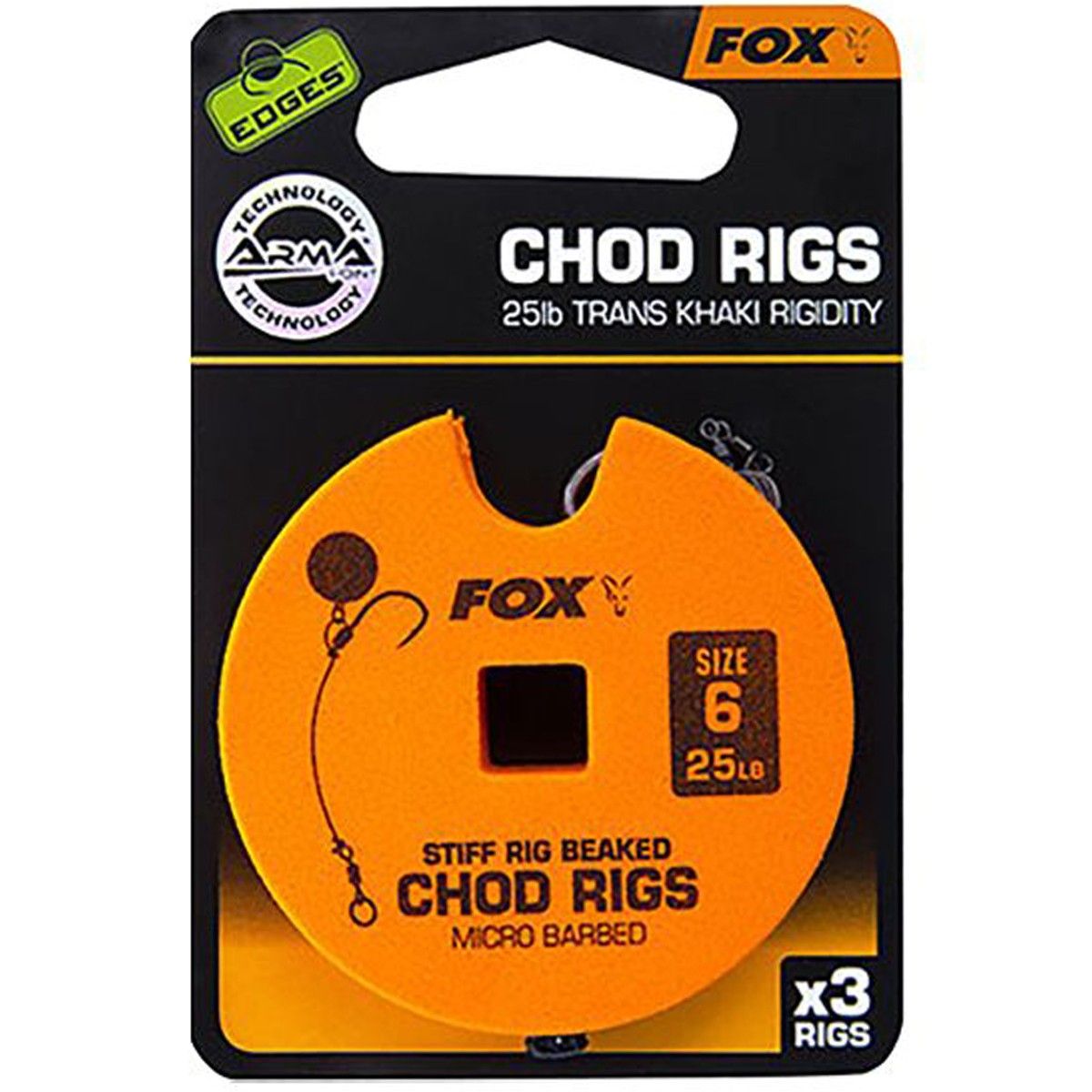 Cada montaje está construido con el monofilamento rígido Edges Rigidity Trans Khaki, un material desarrollado por Fox que ofrece una excelente memoria para mantener la curva perfecta del Chod. Este acabado translúcido en color Trans Khaki se camufla eficazmente en una amplia variedad de fondos, lo que reduce la detección del montaje por parte de peces recelosos.