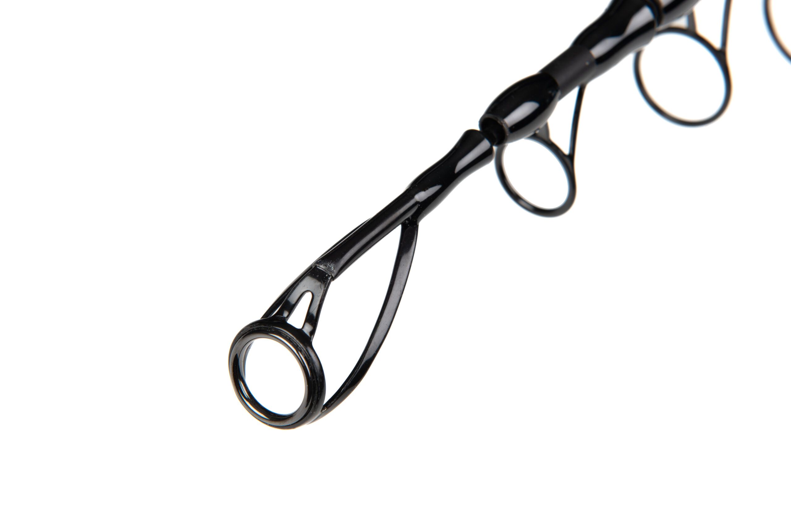 El acabado en negro mate le aporta un toque sobrio y profesional, mientras que la empuñadura cónica ergonómica, combinada con el grip japonés, garantiza comodidad y un agarre seguro incluso en condiciones húmedas. Equipada con guías Slik de estilo minimalista, mejora la salida de línea para alcanzar distancias notables con precisión. Además, incluye un portacarretes de alta calidad de 18 mm, robusto y fiable para carretes de gran capacidad.