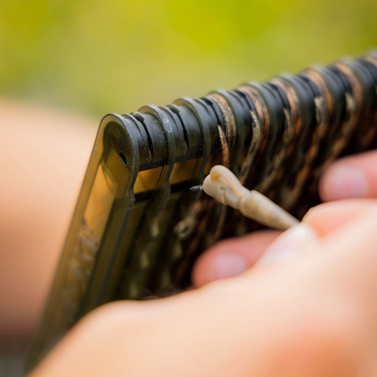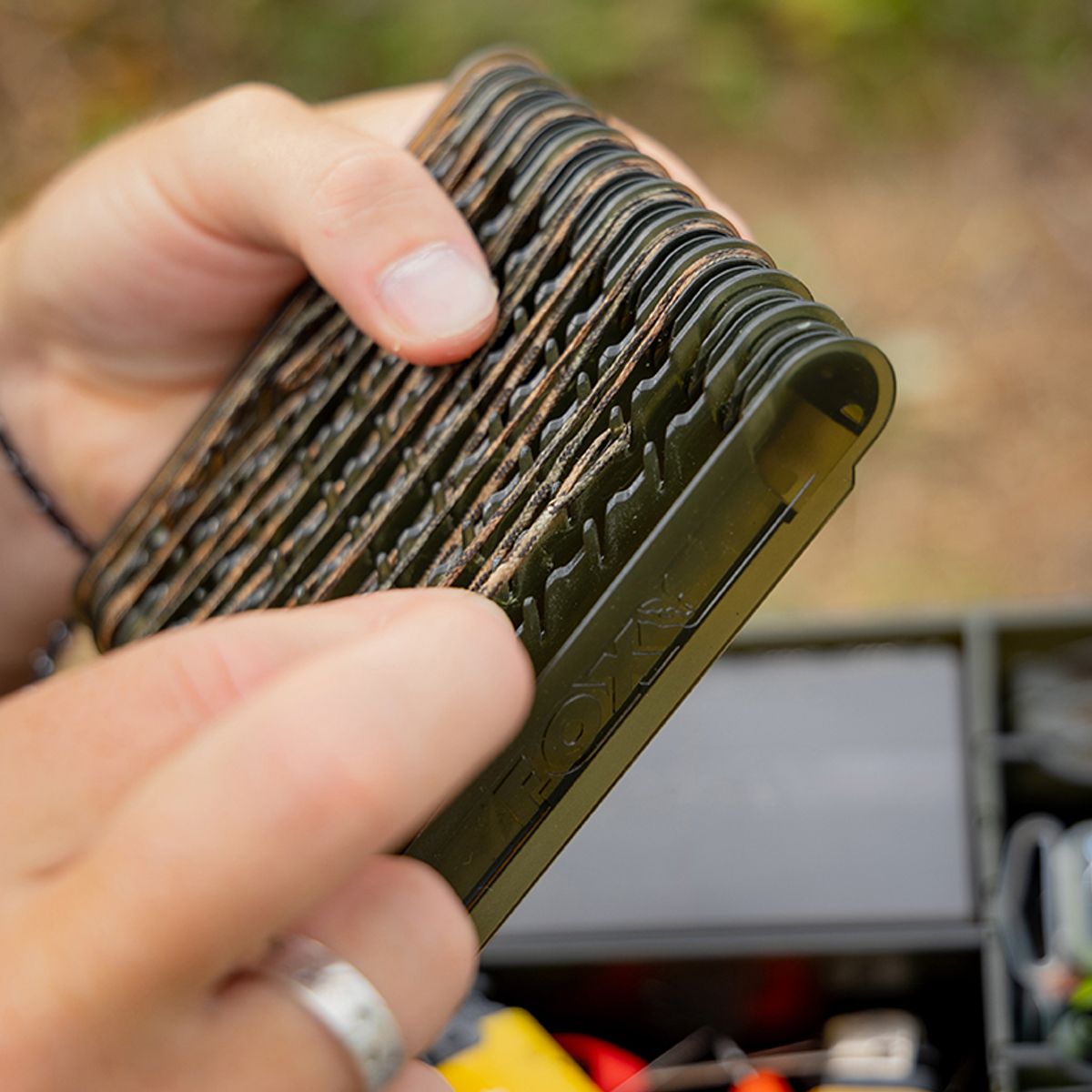 Este modelo permite almacenar hasta 10 bajos de línea preatados, ofreciendo espacio suficiente para tus montajes más habituales. Gracias a su sistema de clavija metálica y secciones moldeadas, puedes fijar los bajos de forma estable y sin riesgo de enredos. Además, el diseño permite guardar no solo los bajos, sino también componentes esenciales del sistema, como clips de plomo, eslabones giratorios, perlas o manguitos de helicóptero.