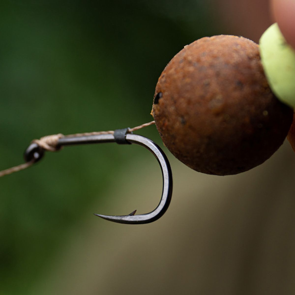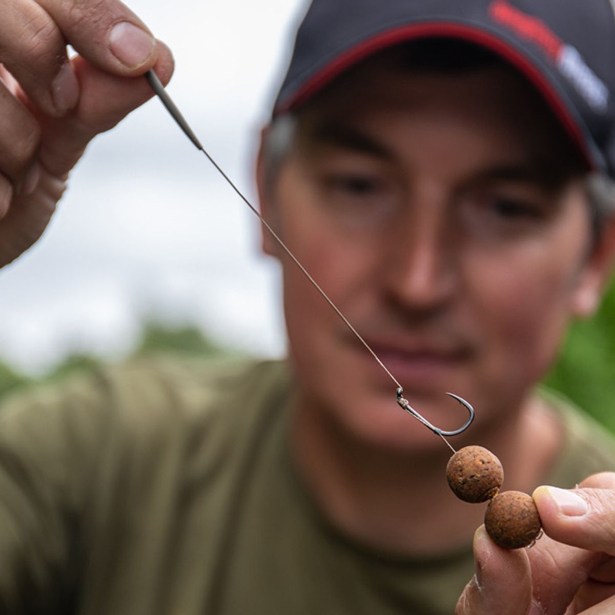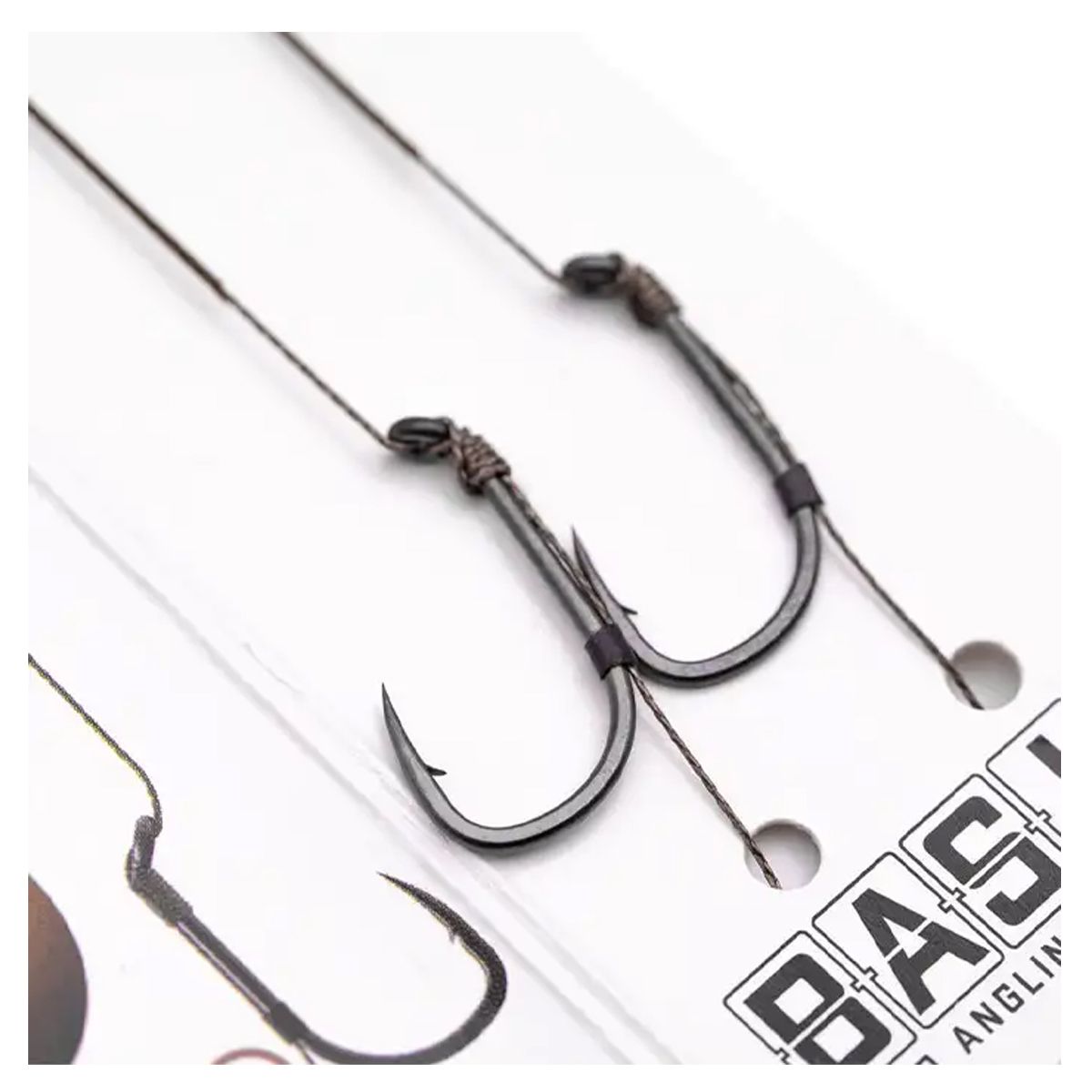 Además, estos montajes se elaboran con el material BASIX Coated Hooklink, de color verde camuflaje, que ayuda a mimetizar la línea en el fondo y evitar la desconfianza de las carpas. La sección pelada junto al anzuelo BASIX Wide Gape mejora el movimiento del cebo y aumenta la eficacia del clavado.