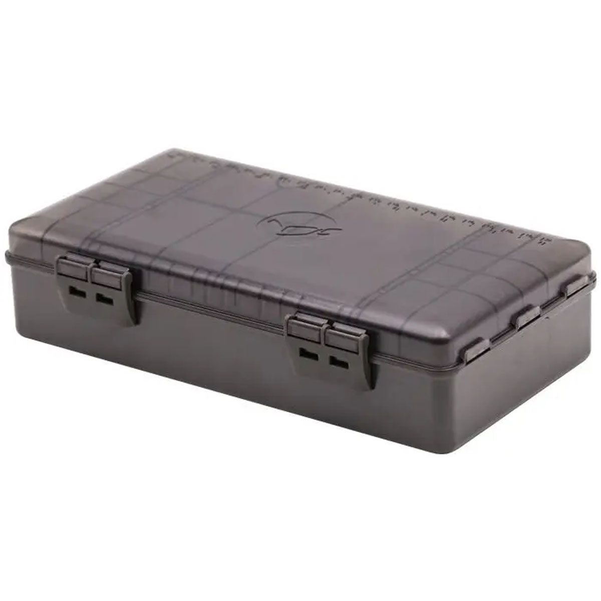 Fabricada con plástico de alto impacto, la Basix Tackle Box soporta golpes, caídas y las duras condiciones de las orillas o embarcaciones. Además, su tapa translúcida permite ver el contenido sin necesidad de abrirla, ahorrando tiempo durante el montaje. La tapa incluye una regla grabada, ideal para medir con precisión tus montajes o ajustar longitudes de hair rigs.