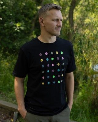 Disponible únicamente en negro, la parte delantera de esta camiseta presenta un diseño de puntos formado por 30 logotipos multicolores de Korda, de ahí el nombre de Dot Tee.
