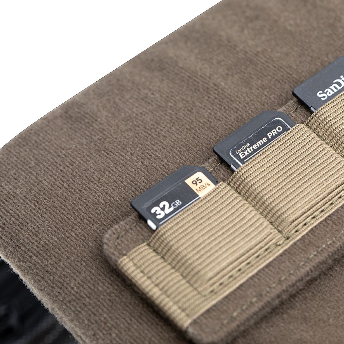 La solapa acolchada superior incluye bolsillos con cremallera para filtros y cables, mientras que un bolsillo interno con cierre en la tapa ofrece espacio adicional para guardar objetos pequeños de manera segura. También incorpora un bolsillo elástico con capacidad para cinco tarjetas SD estándar, facilitando el acceso rápido y organizado a tus medios de almacenamiento.
