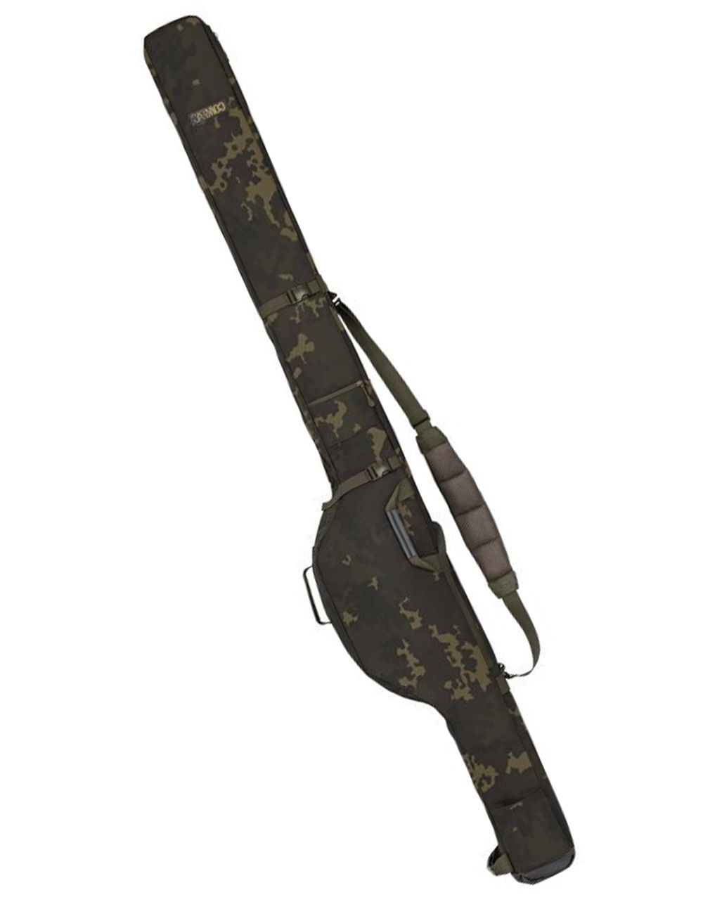 El material exterior está fabricado con el resistente tejido Dark Kamo impermeable, que garantiza durabilidad incluso frente a un uso intensivo. Además, la funda cuenta con una base reforzada e impermeable, lo que permite apoyarla en superficies húmedas sin preocupaciones. Gracias a estas características, la funda se convierte en una inversión fiable para cualquier pescador que busque calidad y resistencia a largo plazo.