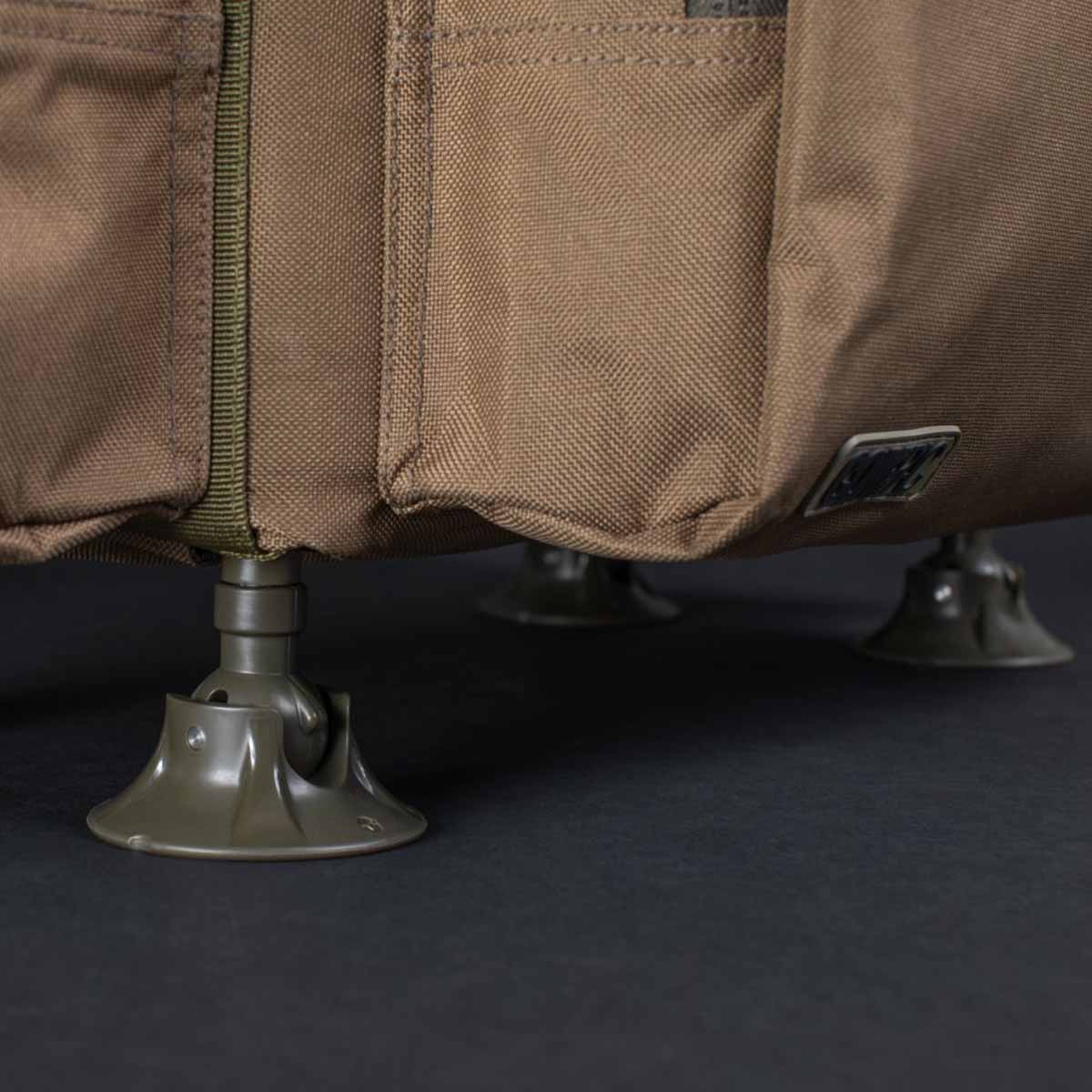 El Korda Compac Framed-L incorpora cuatro patas de barro autonivelantes, que proporcionan gran estabilidad y elevan la base del macuto para evitar el contacto directo con el suelo húmedo. Además, incluye asas reforzadas y cremalleras resistentes, pensadas para soportar un uso intensivo.