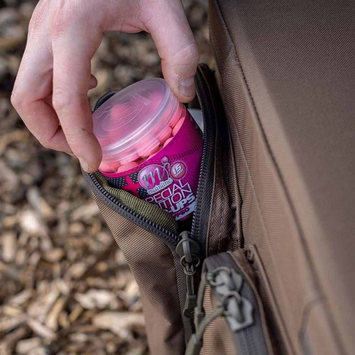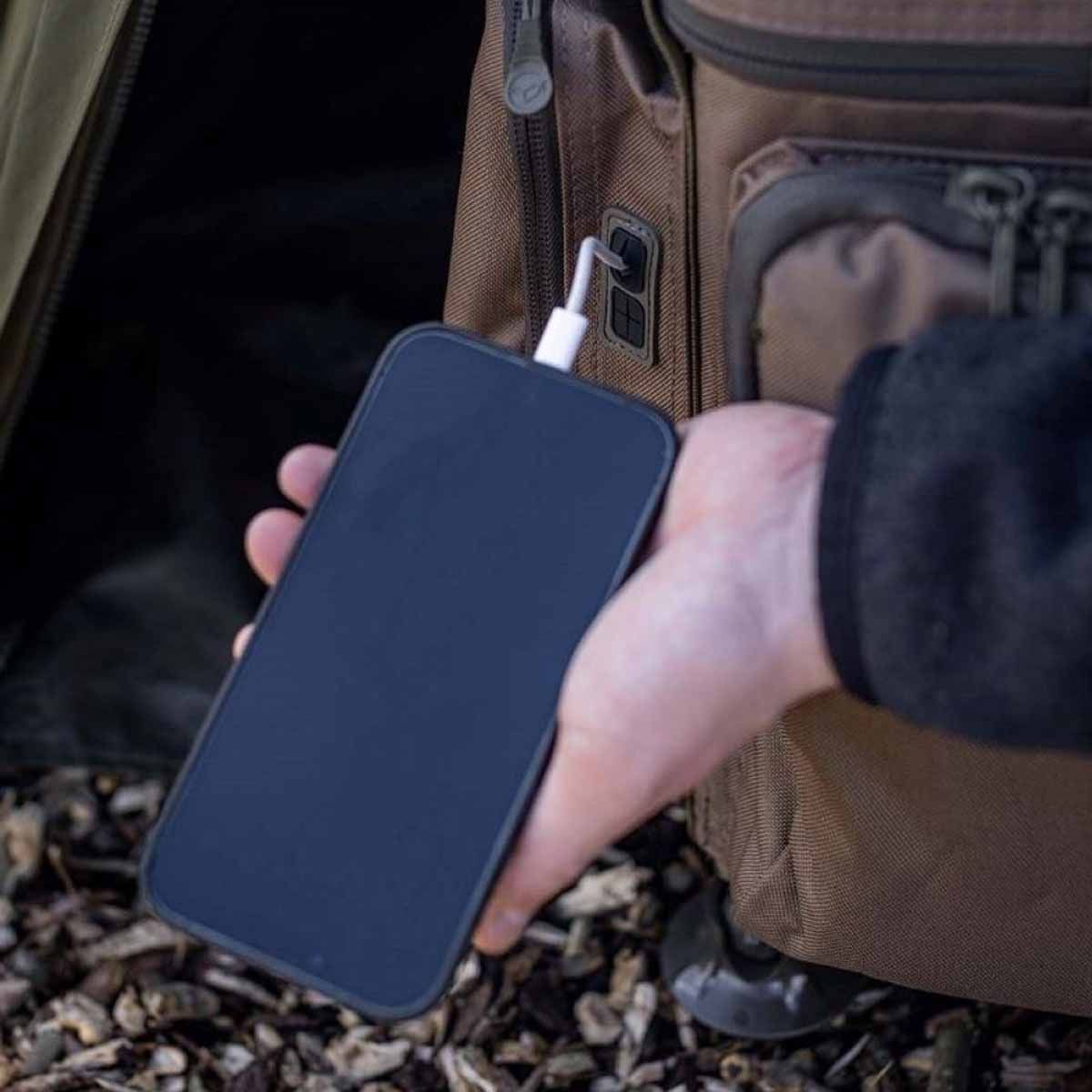 En el exterior, el macuto dispone de cinco bolsillos diseñados estratégicamente. Cuatro de ellos están pensados para combinar con las bolsas Compac EVA 100, 110, 125 y 140, mientras que el bolsillo frontal es lo suficientemente grande para albergar un Korda Tackle Box. Este último incluye dos organizadores internos que pueden configurarse a tu gusto. Los bolsillos laterales cuentan con aberturas preformadas para cables de carga, lo que te permitirá mantener tus dispositivos electrónicos organizados y listos para usar.