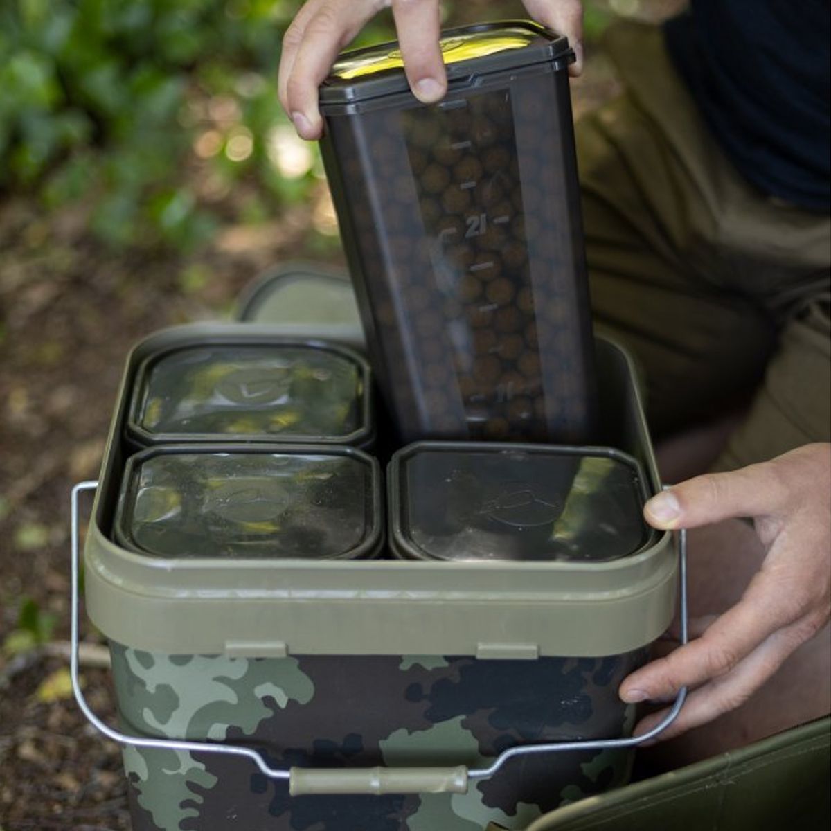 Este innovador conjunto incluye cuatro contenedores duraderos que encajan a la perfección dentro de un cubo de 17 litros, optimizando el espacio y facilitando la organización del material carpfishing. Cada recipiente cuenta con tapas blandas herméticas, que garantizan un cierre estanco y evitan derrames o contaminación del contenido. Además, incorporan marcadores laterales de 0,25 litros, perfectos para medir con precisión tus mezclas de spod o proporciones de cebo, algo esencial para quienes buscan una alimentación precisa en sus zonas de pesca.