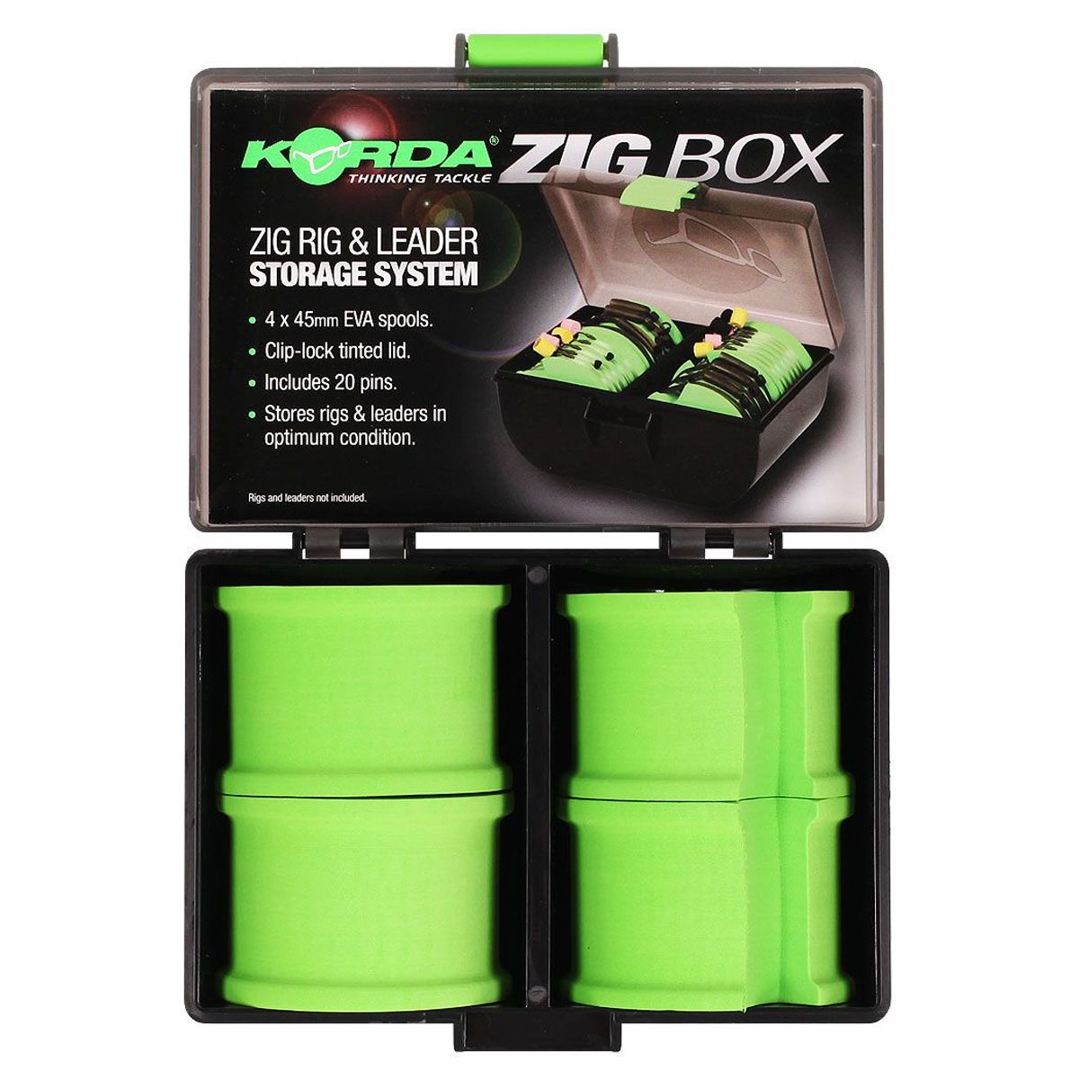 El Zig Box de Korda ofrece una solución de almacenamiento robusta y compacta para los aparejos y bajos de línea.Almacenamiento de los aparejos de zig-zag: Simplemente, introduzca el anzuelo en el borde plano de la sección recortada de la bobina y, con un poco de tensión, envuelva el eslabón del anzuelo con cuidado. Fije el bucle o el eslabón giratorio del extremo del aparejo en la bobina.Almacenamiento de los plomos: Introduzca el eslabón giratorio o Kwik-Link en el borde curvado de la sección cortada de la bobina antes de envolver el bajo de línea cuidadosamente alrededor de él. Asegure el extremo del bajo de línea con un segundo pasador.