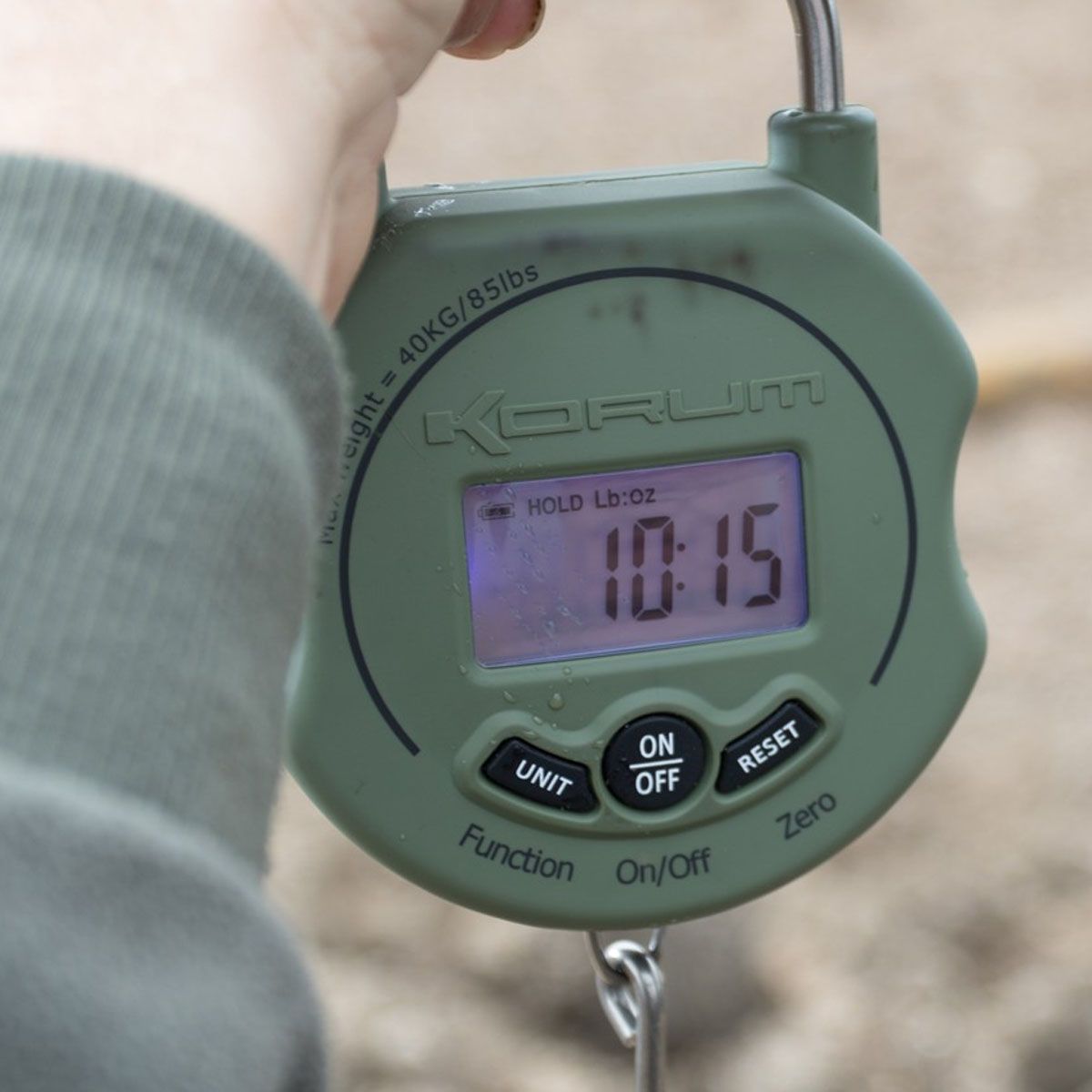 Con una capacidad máxima de 40 kg (85 lb), la Korum permite pesar sin esfuerzo incluso las carpas más grandes. Su pantalla digital retroiluminada asegura una lectura clara y precisa tanto de día como de noche, una ventaja decisiva en capturas nocturnas o condiciones de poca luz.