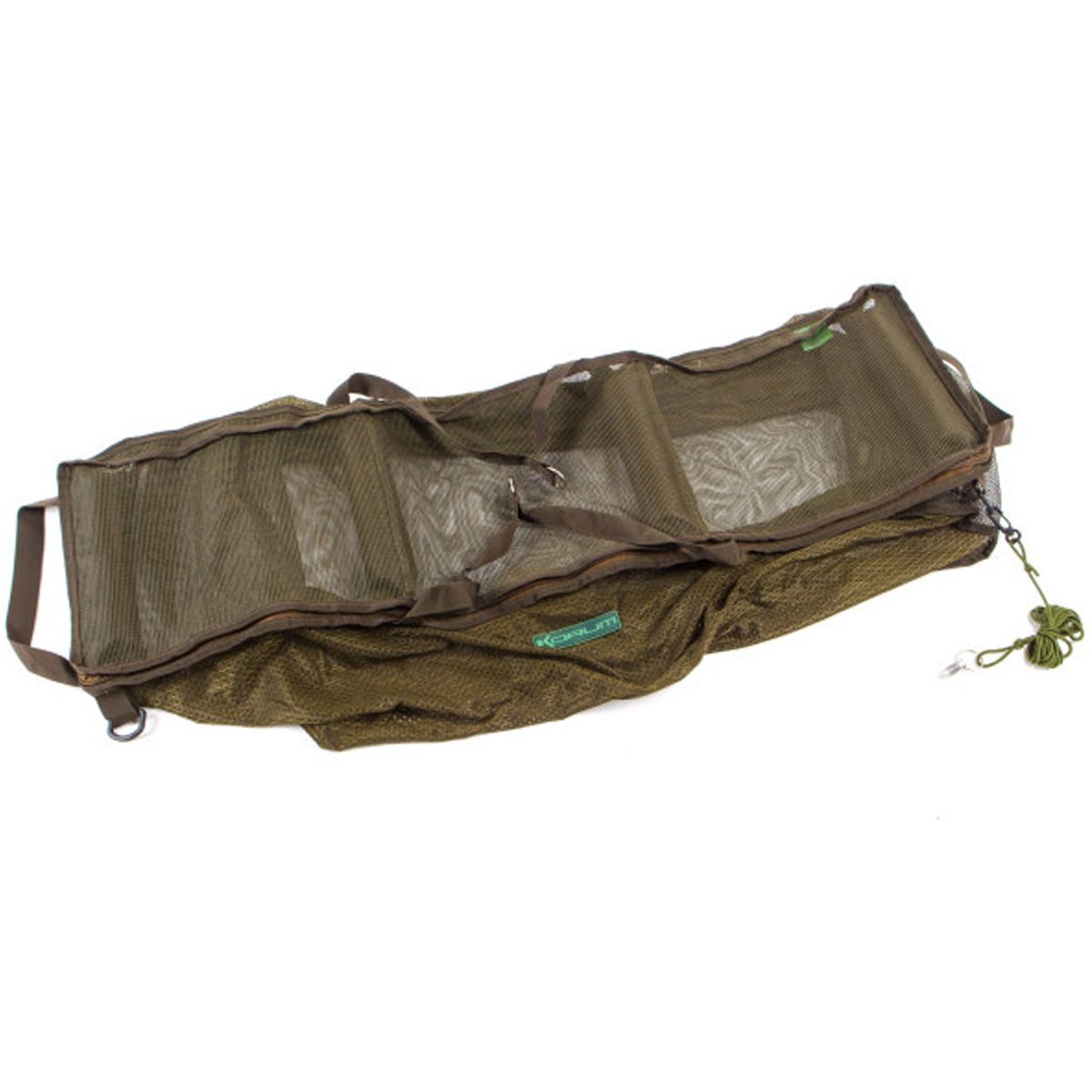Una de sus mayores ventajas es su portabilidad. El Korum Compact Sling se pliega fácilmente y se guarda en una bolsa impermeable de pequeño tamaño, ideal para transportar en mochilas o carretillas sin ocupar espacio. Incluye además una cuerda de saco integral de alta resistencia, perfecta para asegurar la eslinga en el agua de forma estable y controlada.
