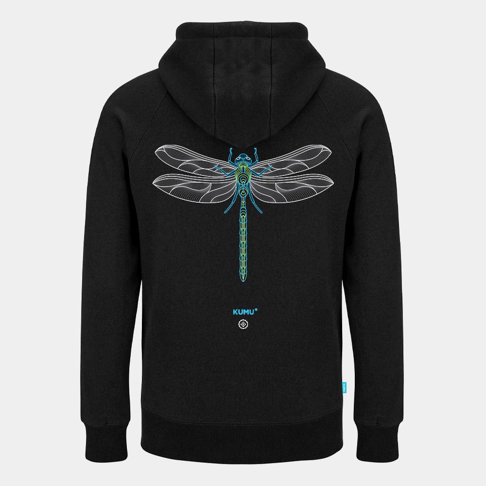 El gráfico de la Emperor Hoodie está elaborado mediante serigrafía de cinco colores. Esto permite que cada trazo y matiz cobre vida, creando un efecto dinámico y vibrante. Los tonos de azul eléctrico y verde se combinan para reflejar el brillo natural de las alas de la libélula, logrando un diseño que destaca por su originalidad y belleza.