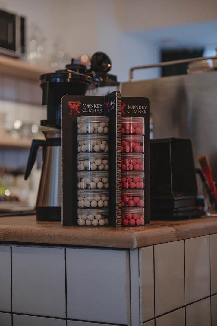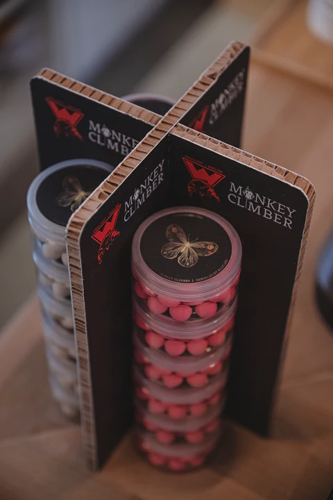 Las Monkey Climber MC x Waasland Tackle Shop collab pop ups I Butterflies 15 mm (OG Scopex) son cebos de anzuelos de edición colaborativa diseñados para pescadores de carpas que buscan una herramienta de pesca potente, versátil y visualmente atractiva, resultado de una alianza entre Monkey Climber, la prestigiosa marca de cebos, y Waasland Tackle Shop, tienda y proyecto especializado en carpfishing.