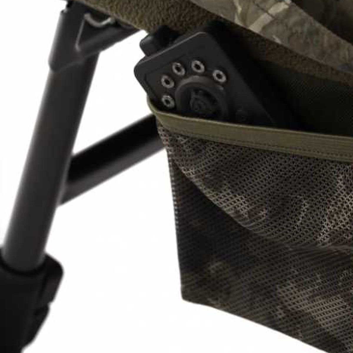 El mecanismo de bisagra ampliado con correas de compresión gemelas facilita un plegado completamente plano, ideal para un transporte y almacenamiento más cómodos. Por otro lado, los bolsillos laterales de malla camuflaje en ambos lados del marco son perfectos para guardar objetos personales o utensilios pequeños de pesca.
