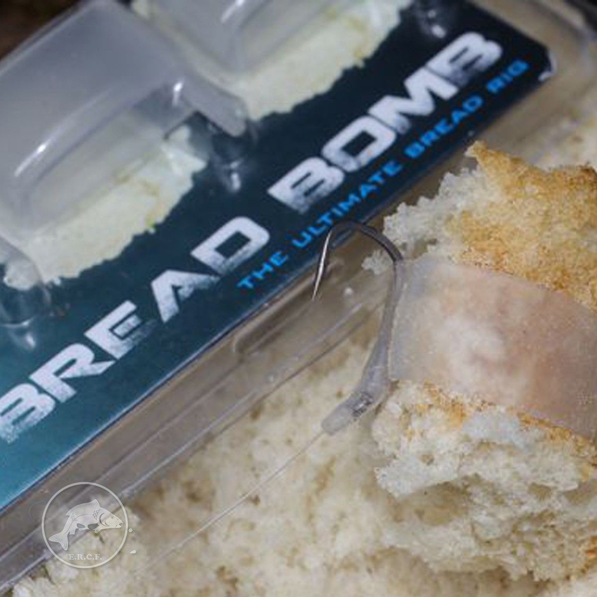 El Bread Bomb sujeta con firmeza un trozo generoso de copos de pan arrancados del centro de una hogaza o una corteza grande de pan sin cortar, y asegura el anzuelo del mismo modo que una cinta de bolitas.
