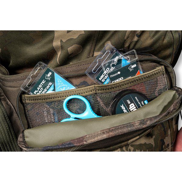 Dos bolsillos exteriores con cremallera y bolsillos de malla para receptores, bajos, cebos o herramientas.