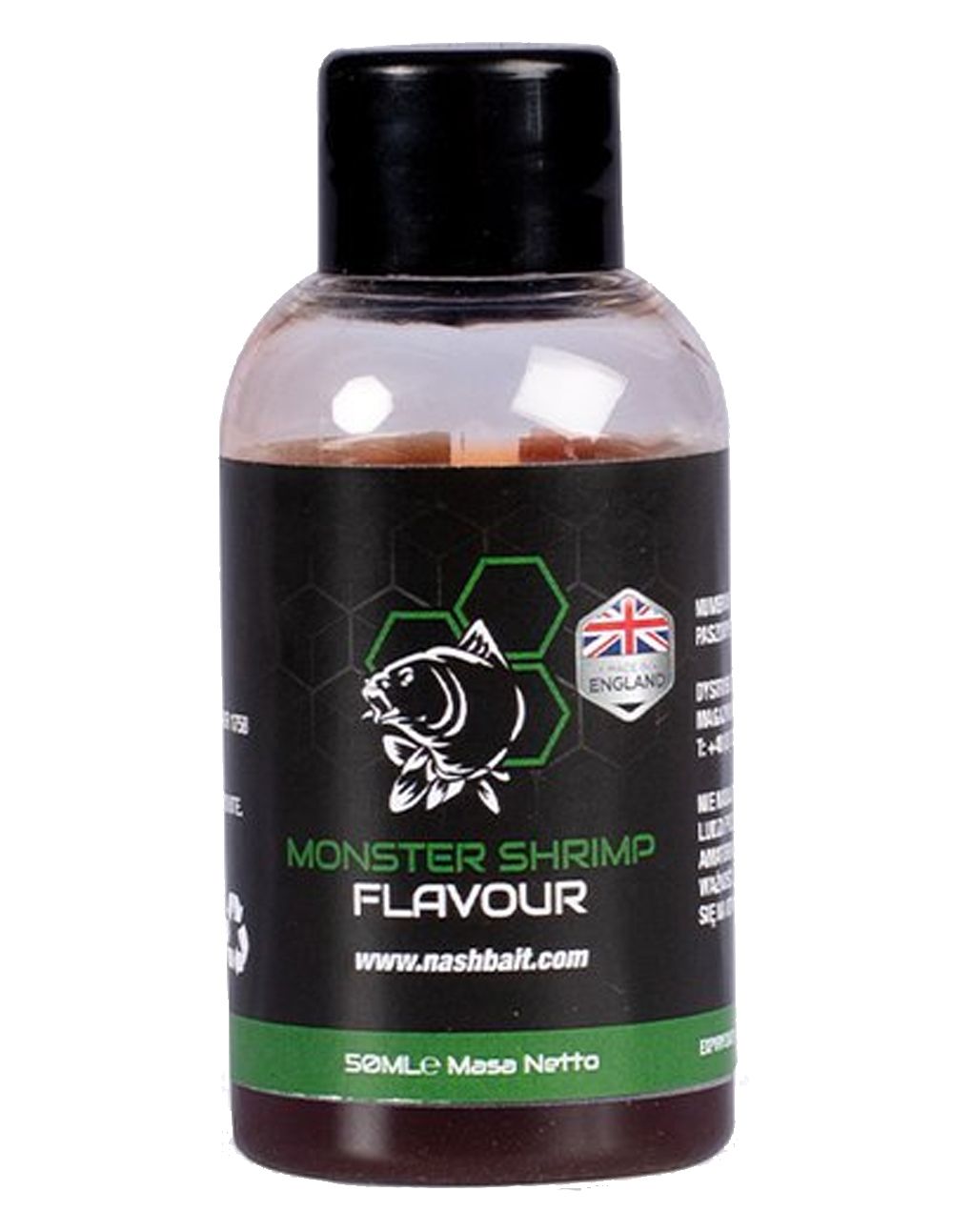 ¿Buscas un atractor de sabor que emule a la perfección el cebo natural de los grandes lagos y ríos? El Nash Monster Shrimp Flavour es el flavour que necesitas. Este líquido atractor no es un simple flavour, es una premezcla potente que combina un trío marino letal: cangrejo, langosta madura y la mortífera pasta de gamba salada de Nashbait. Esta fórmula está en los mismos niveles de concentración que los exitosos boilies Monster Shrimp, lo que garantiza que estás utilizando un atractor probado y verdadero. Con él, tu material carpfishing se convierte en una herramienta irresistible para las carpas más grandes.
