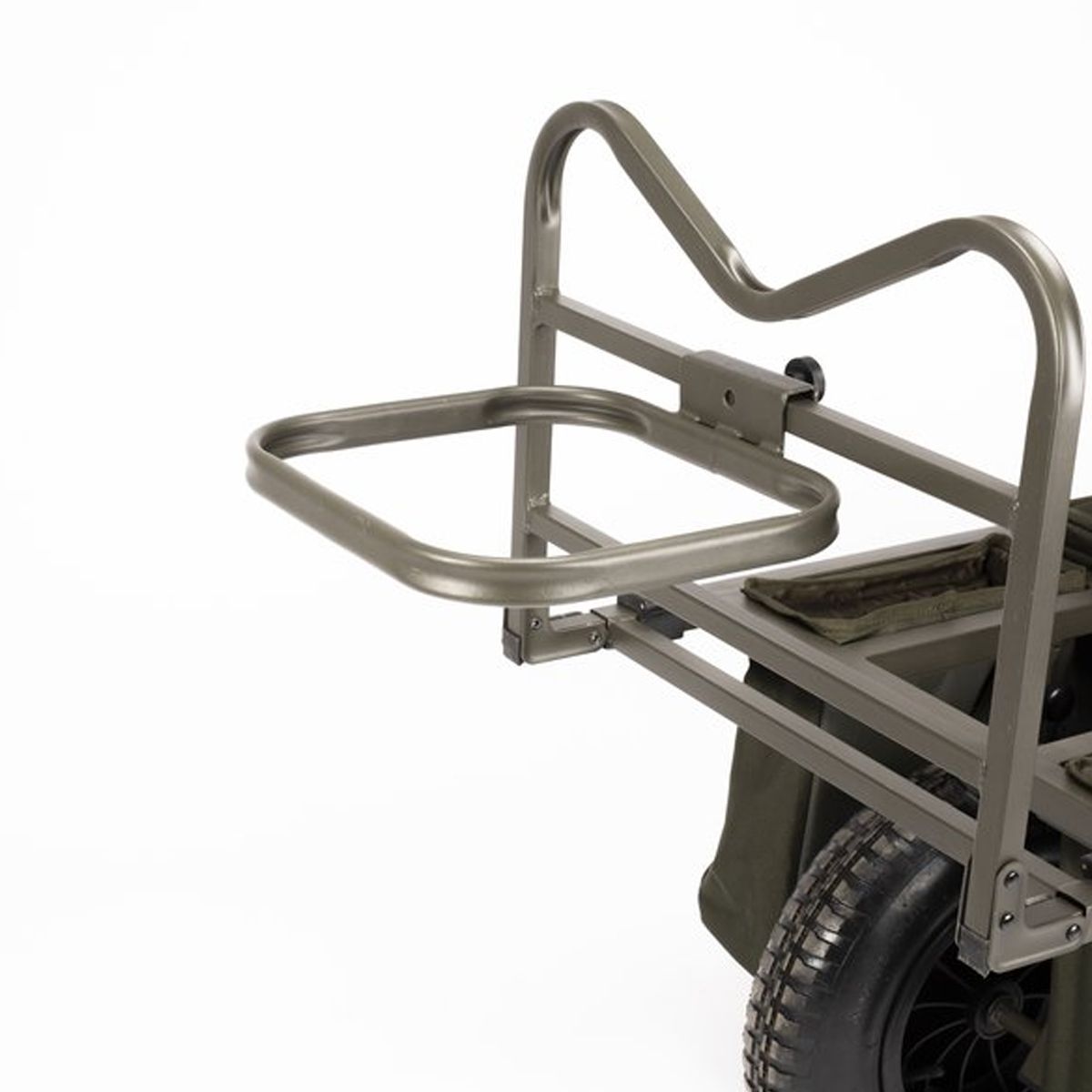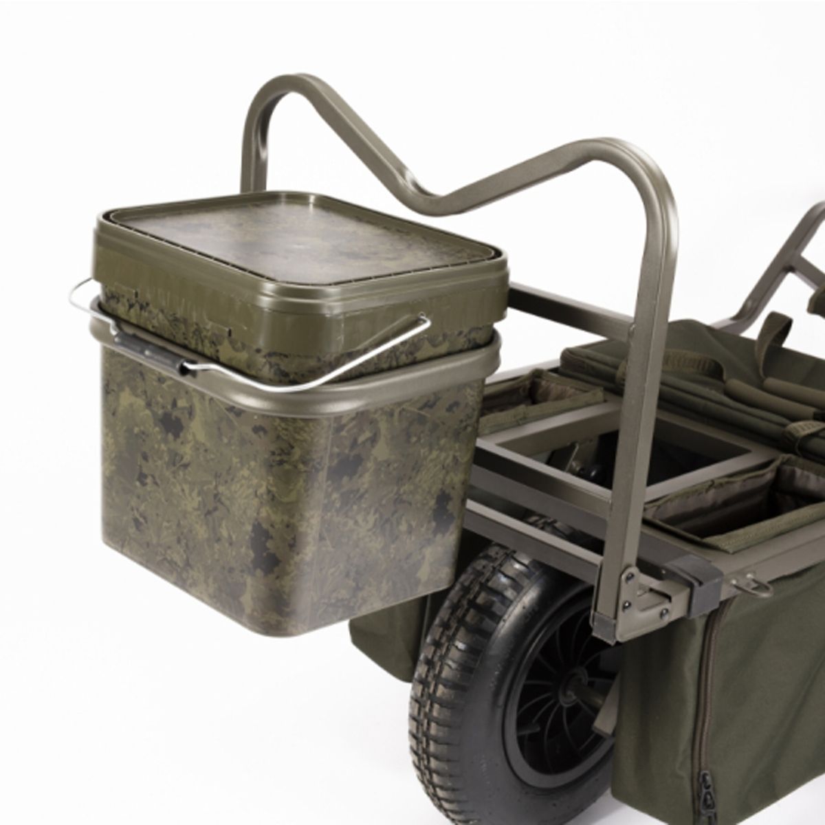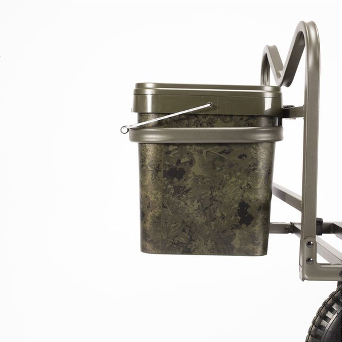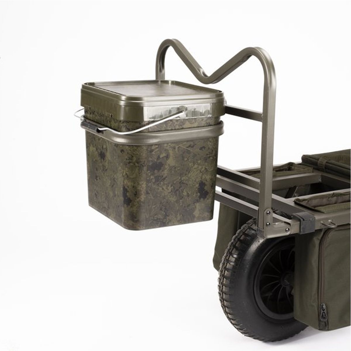 Fabricado en metal de alta resistencia, el soporte está diseñado para acoplarse fácilmente a los carritos Nash Trax Barrows y Power Barrows mediante tornillos de mariposa, sin necesidad de herramientas adicionales. Su estructura externa permite montar el cubo en los laterales o en la parte frontal del carro, liberando espacio de carga para otros equipos voluminosos como bolsas, sillas o tiendas.