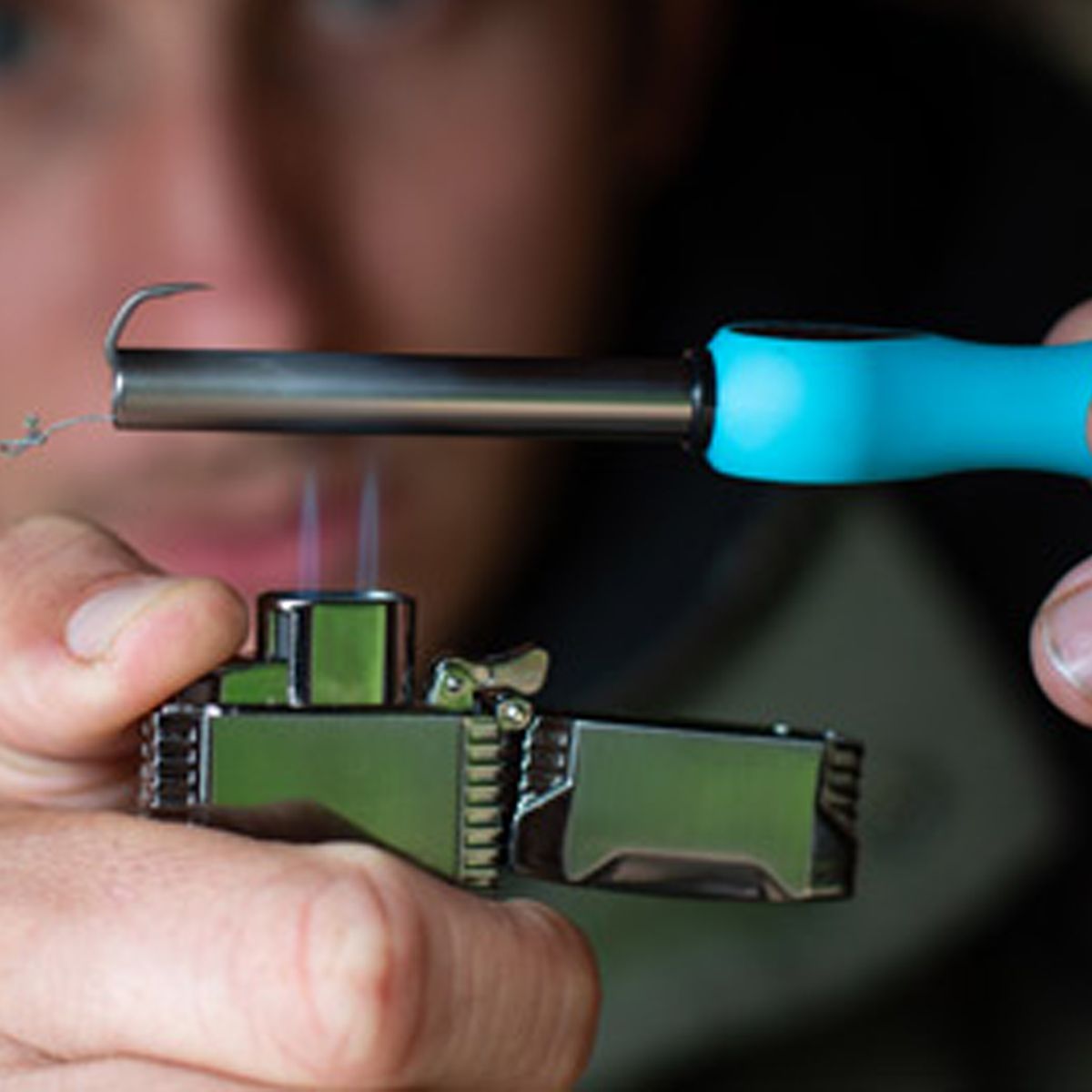 Su funcionamiento es muy sencillo y eficiente: primero, moja todo el equipo para facilitar el deslizamiento. Luego, inserta el anzuelo y el tubo en el orificio central de la herramienta Shrinker y asegura el enlace. Aplicando calor con un encendedor de chorro a la parte inferior del tubo, en cuestión de segundos se encoge de forma perfecta. Finalmente, se puede quitar la herramienta y moldear el montaje con facilidad, consiguiendo un acabado profesional en cada aparejo.