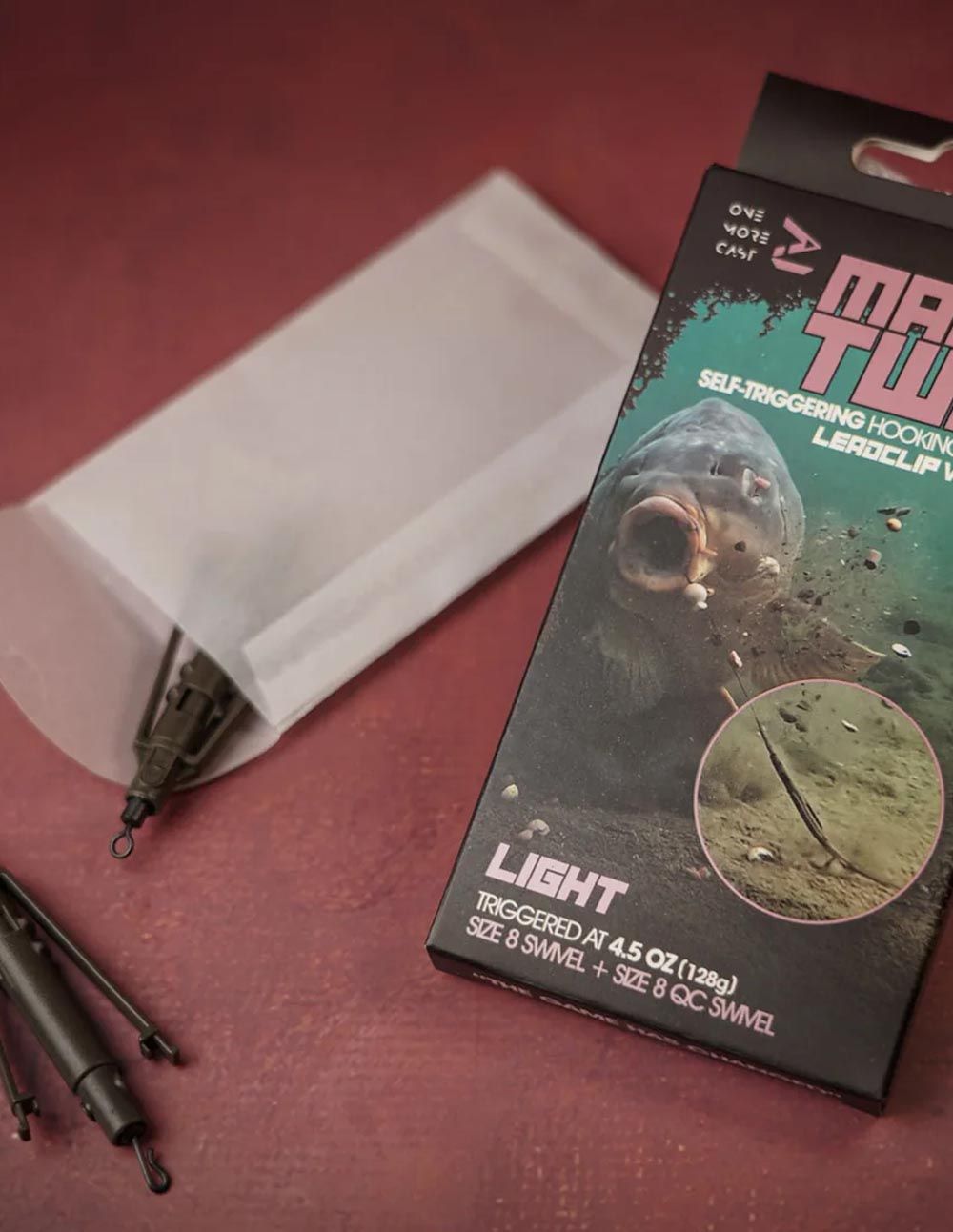 La versión Lead Clip es extremadamente fácil de montar. Solo necesitas el OMC Pin Lead Clip y un Swivel de tamaño 8. Tira del Lead Clip y conecta el Hooklink al Swivel QC en el extremo del Magic Twig. Una vez extendido y cargado en la posición LOADED, simplemente asegúralo con PVA antes de realizar un lance largo, evitando descargas accidentales durante el lanzamiento o al usar cebos grandes.