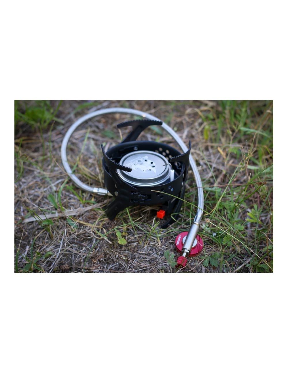 Con un peso de solo 320 gramos y medidas de 95 x 95 x 90 mm en transporte, esta cocina demuestra que la eficiencia no está reñida con la portabilidad. En uso, alcanza los 170 x 170 x 90 mm, ofreciendo estabilidad para todo tipo de utensilios.