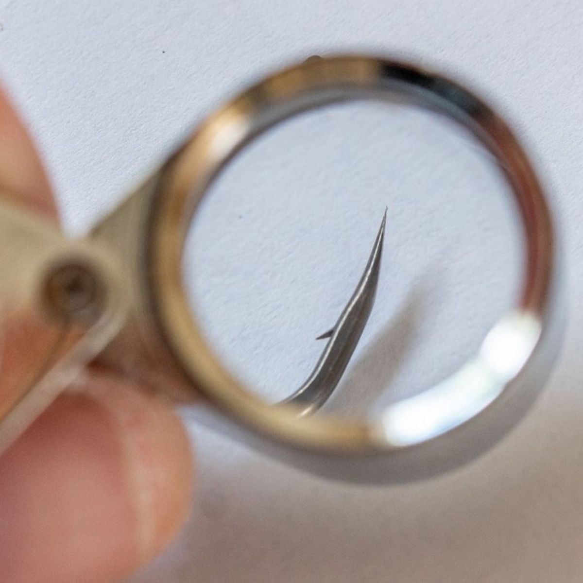 Punta de aguja larga con micro púa, que ofrece una retención firme sin dañar al pez.