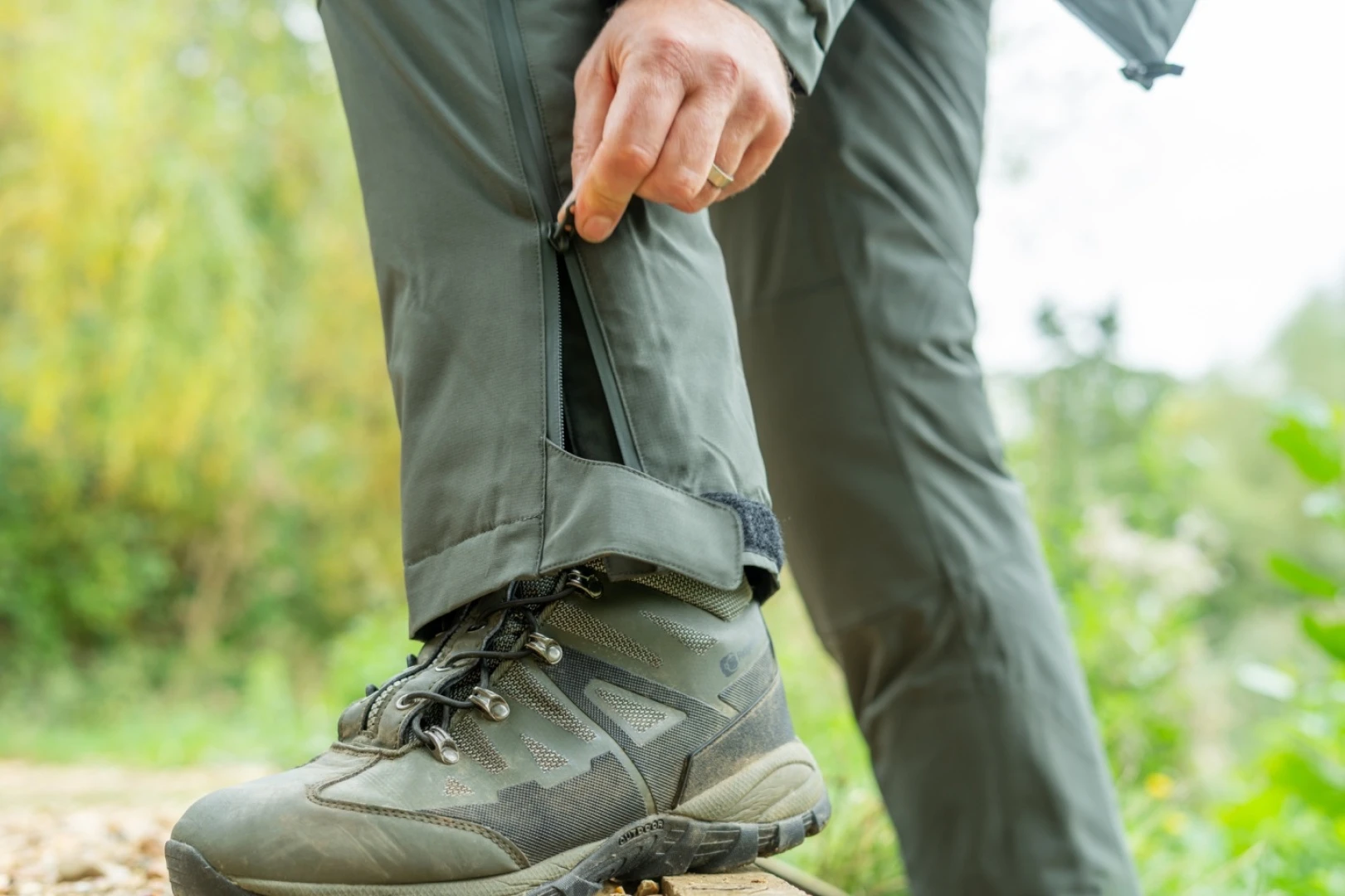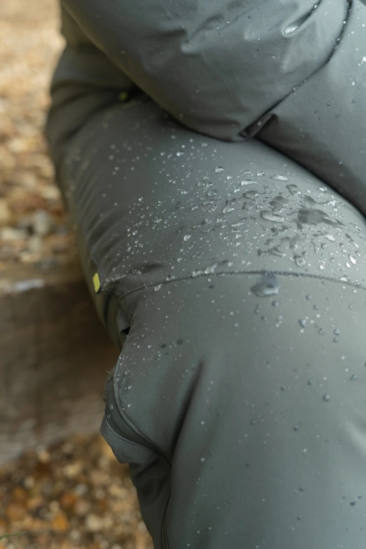 La capa exterior está hecha de resistente poliéster ripstop y está cubierta con una membrana impermeable. Los refuerzos en zonas críticas —en las rodillas, asiento y partes internas de las piernas— aumentan la durabilidad y protegen la tela contra el desgaste. En la parte exterior de las piernas hay cremalleras impermeables que llegan hasta las rodillas, facilitando ponerse y quitarse los pantalones sin necesidad de quitarse las botas. Las cremalleras cuentan con solapas cortavientos para mejorar la protección contra el frío.