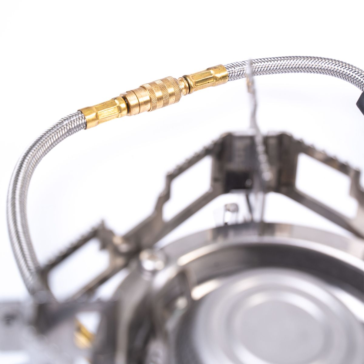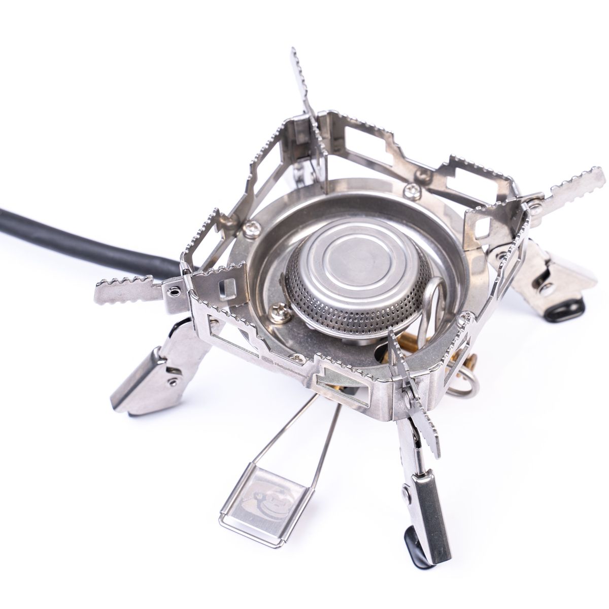 Este hornillo destaca por su diseño cuadrilátero súper estable, con un centro de gravedad bajo y patas plegables regulables en altura, que permiten colocarlo incluso en superficies irregulares o en orillas complicadas. Su estructura está fabricada en acero inoxidable trenzado, lo que le otorga una resistencia excepcional sin sumar peso innecesario.