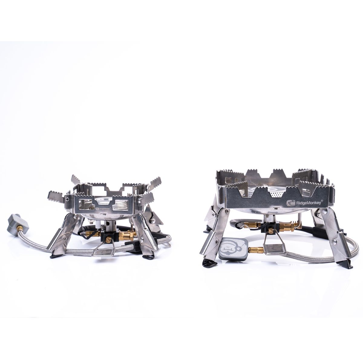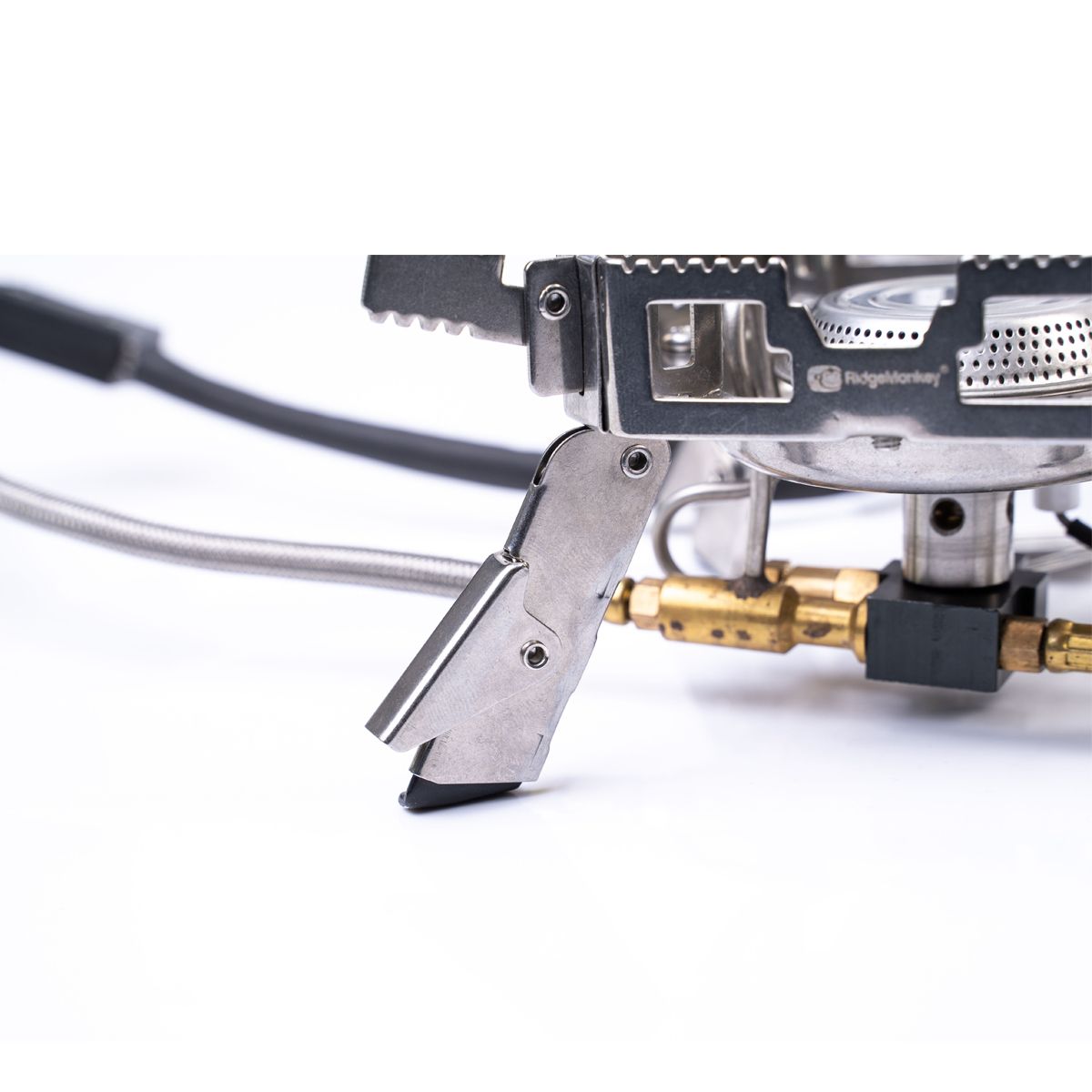 Además, RidgeMonkey ha incorporado mejoras notables: el nuevo tubo condensador de gas optimiza la combustión incluso en climas fríos, mientras que el encendido piezoeléctrico remoto simplifica la puesta en marcha en segundos. Este hornillo cuenta también con soportes nuevos para bandejas plegables, facilitando el uso de múltiples accesorios de cocina, como sartenes, cazuelas o tostadoras RidgeMonkey.
