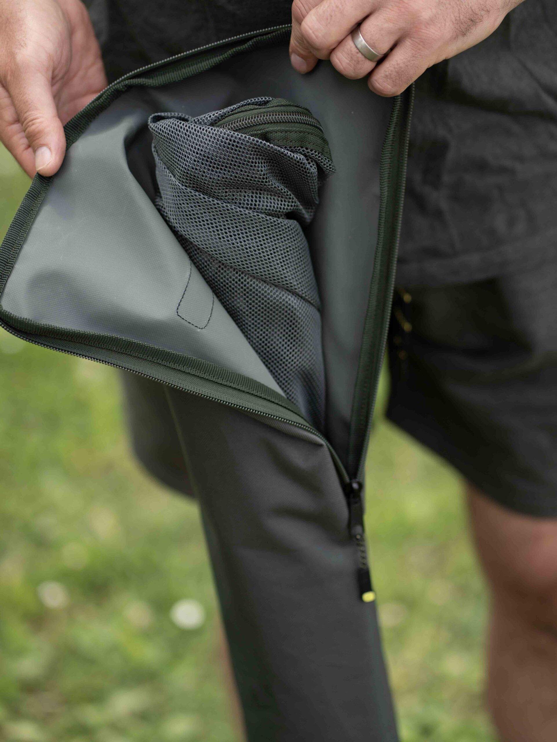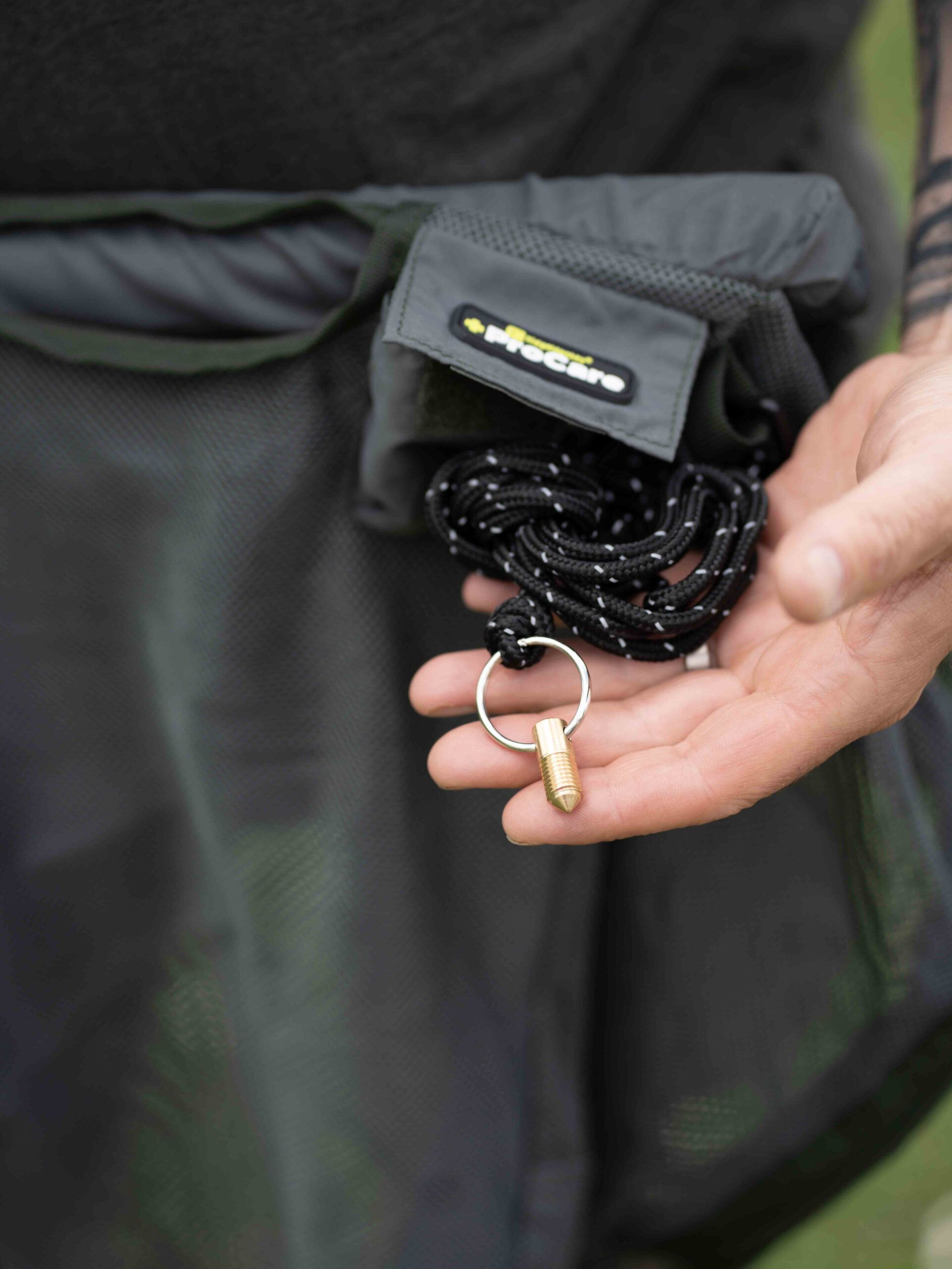 El RidgeMonkey Saco de Retención y Pesaje Estándar se suministra con una funda de viaje antiolor que facilita su transporte y almacenamiento tras cada sesión. También incluye un cordón de retención con adaptador de rosca 3/8 BSF, perfecto para fijarlo a una pica y mantenerlo asegurado en la orilla.