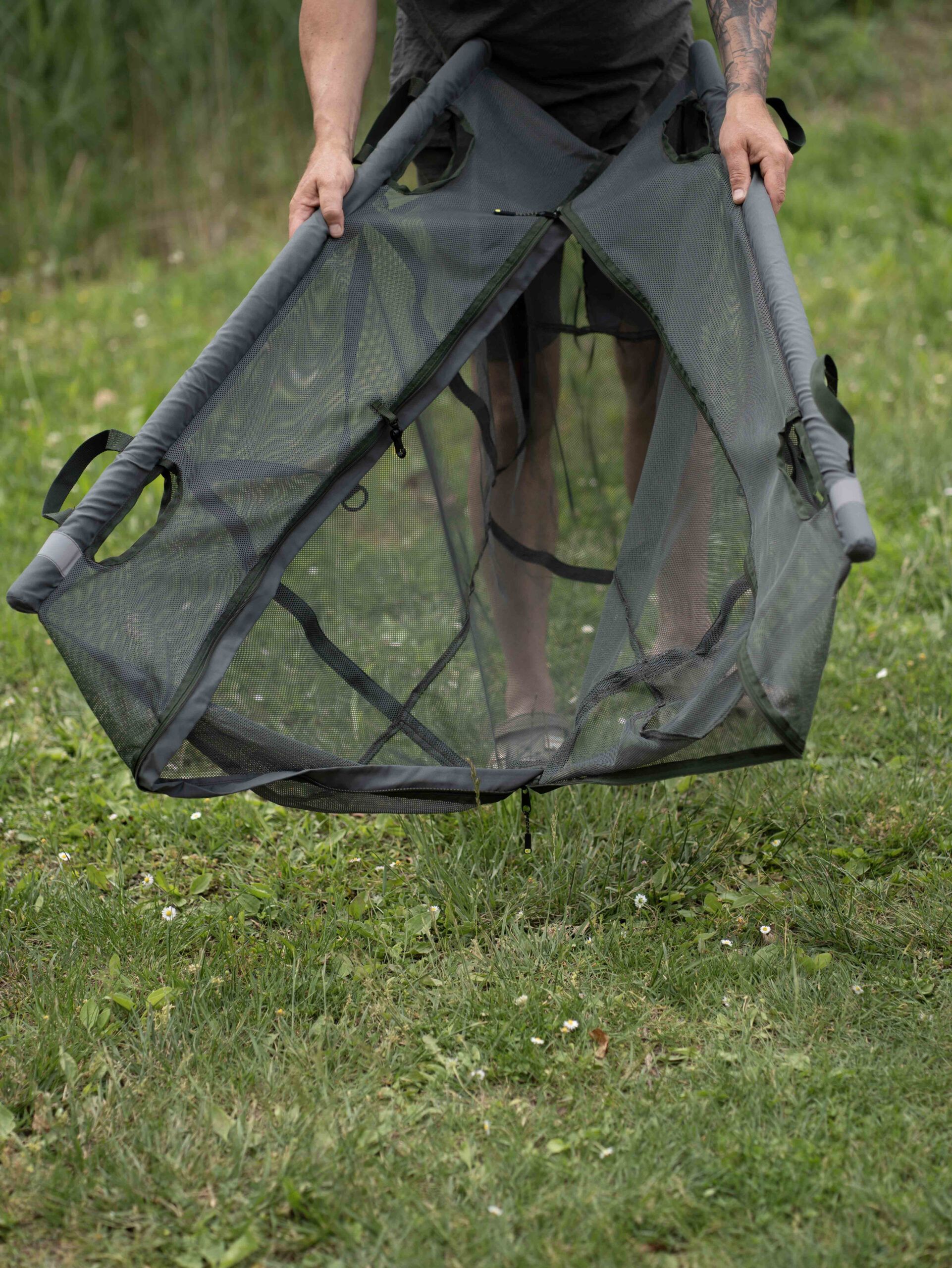 Cada detalle está diseñado pensando en la seguridad del pez. El deflector interior acolchado evita roces con la cremallera, mientras que la malla suave y fluida permite un drenaje rápido del agua, reduciendo el tiempo de manipulación fuera del entorno natural.
