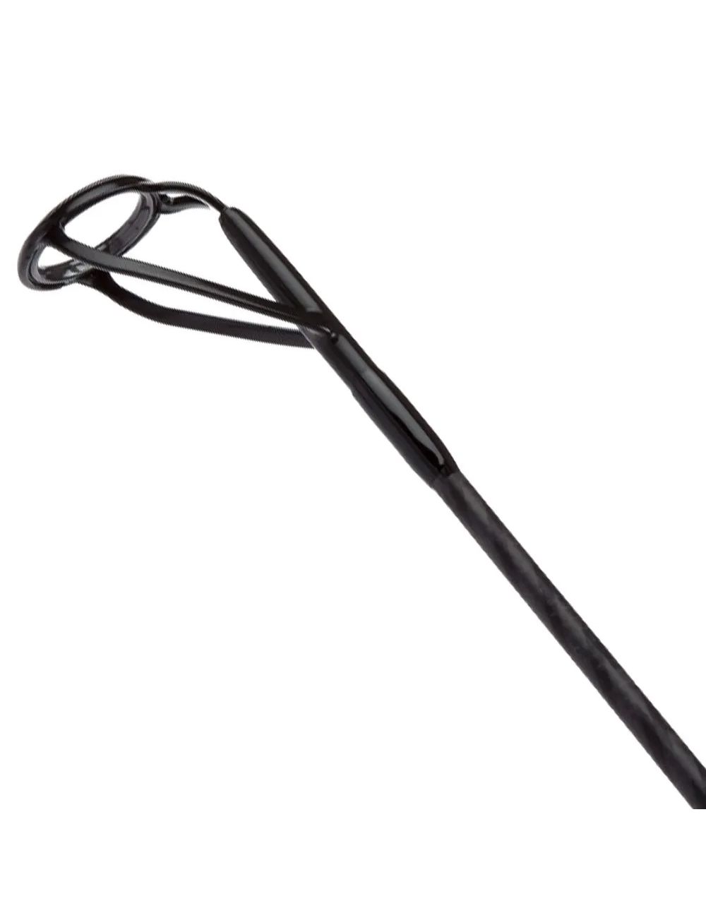 Estéticamente, destaca por su acabado en carbono blindado 2K-Axial, que le da un aspecto moderno y robusto. Incluye guías superligeras M-Series DL negras, con anilla de punta de cerámica anti-fractura para mayor durabilidad. Su patrón de anillado de 50 mm garantiza una salida fluida del hilo, incluso con líneas gruesas.