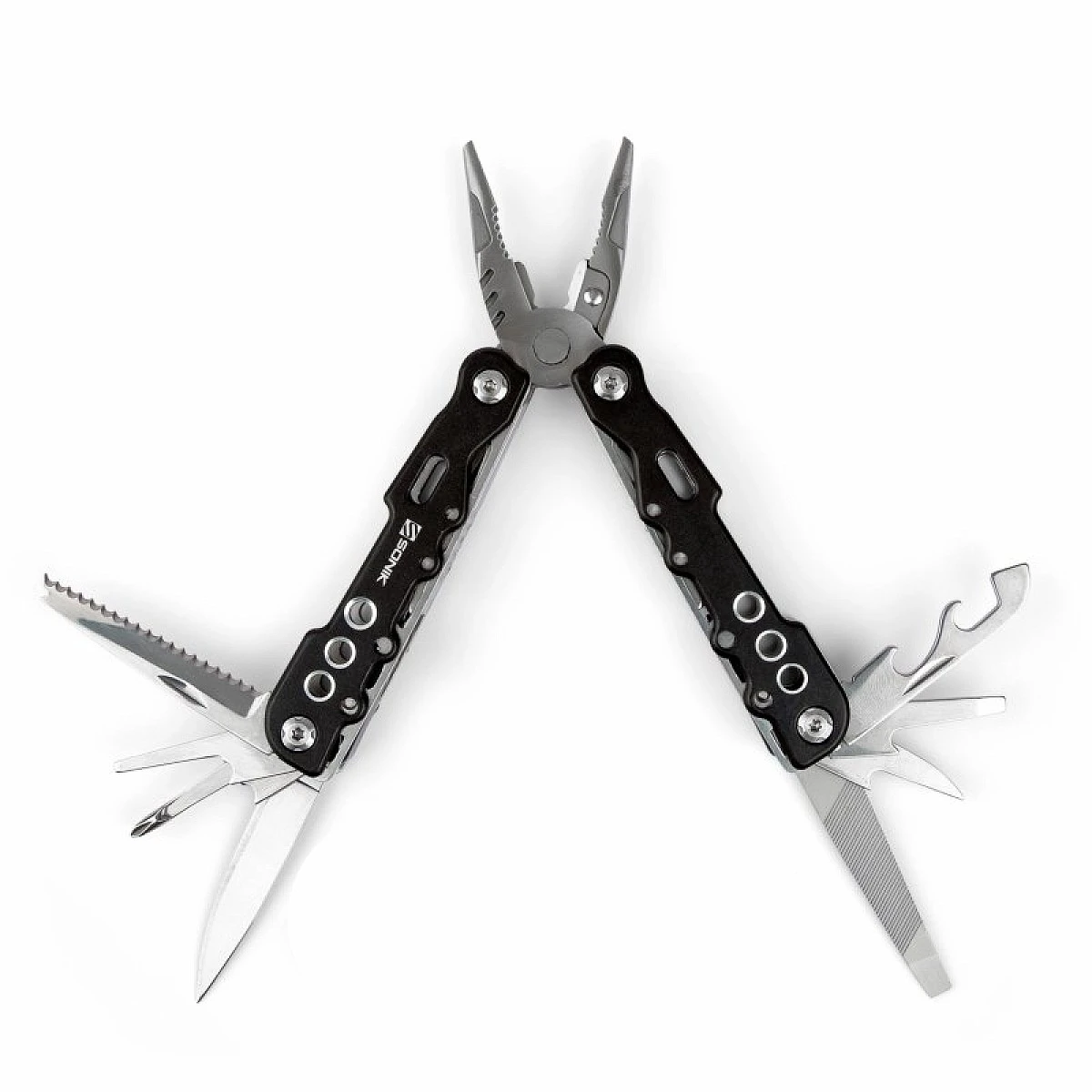Sonik Multi-Tool cuenta con catorce herramientas esenciales que satisfarán incluso a los usuarios más exigentes. Entre ellas, encontramos alicates de punta fina con resorte, ideales para trabajos precisos. Además, la herramienta está equipada con un cuchillo, una hoja de sierra y abrebotellas y abrelatas. Para los aficionados al bricolaje, están disponibles destornilladores planos de varios tamaños y un mini destornillador cruciforme. El usuario también dispone de limas para metal, tanto de grano grueso como fino, y un punzón.