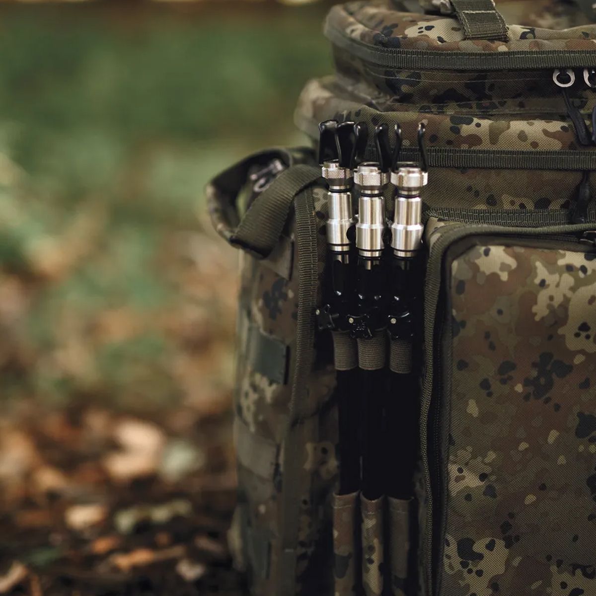 La Camfleck Rucksack cuenta con tres soportes elásticos para bastones en cada lateral, junto con correas adicionales para asegurar otros accesorios como paraguas, redes o fundas compactas. En su interior, varios bolsillos estratégicamente distribuidos permiten guardar herramientas, cajas de montaje y objetos personales de forma segura y accesible.