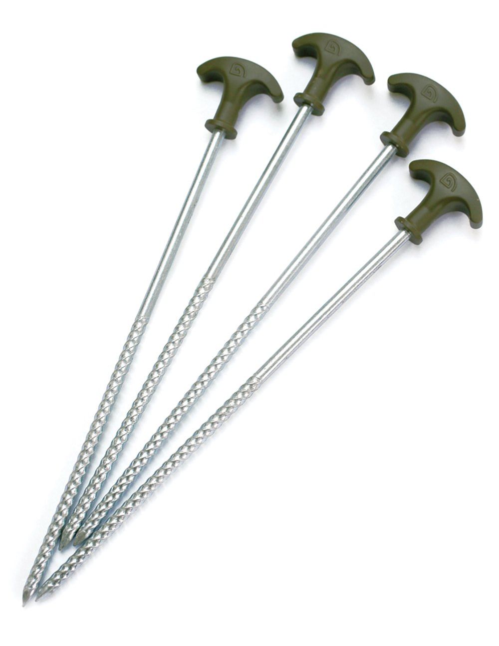 Cuando se instala en lugares blandos o arenosos, poder anclar su refugio es de suma importancia para protegerlo de manera efectiva de los elementos, y la longitud adicional de las clavijas Bivvy de 12 pulgadas lo permite. Se suministran en paquetes de cuatro, son ideales para usar en los puntos de anclaje delanteros y traseros para mantener su refugio en su lugar durante los vientos fuertes y profundizar en terrenos más firmes donde una clavija estándar puede no ser tan efectiva. Se han fabricado con acero súper robusto y se han acabado con cabezas de plástico, lo que le permite empujar y retirar fácilmente del suelo con un mínimo esfuerzo.