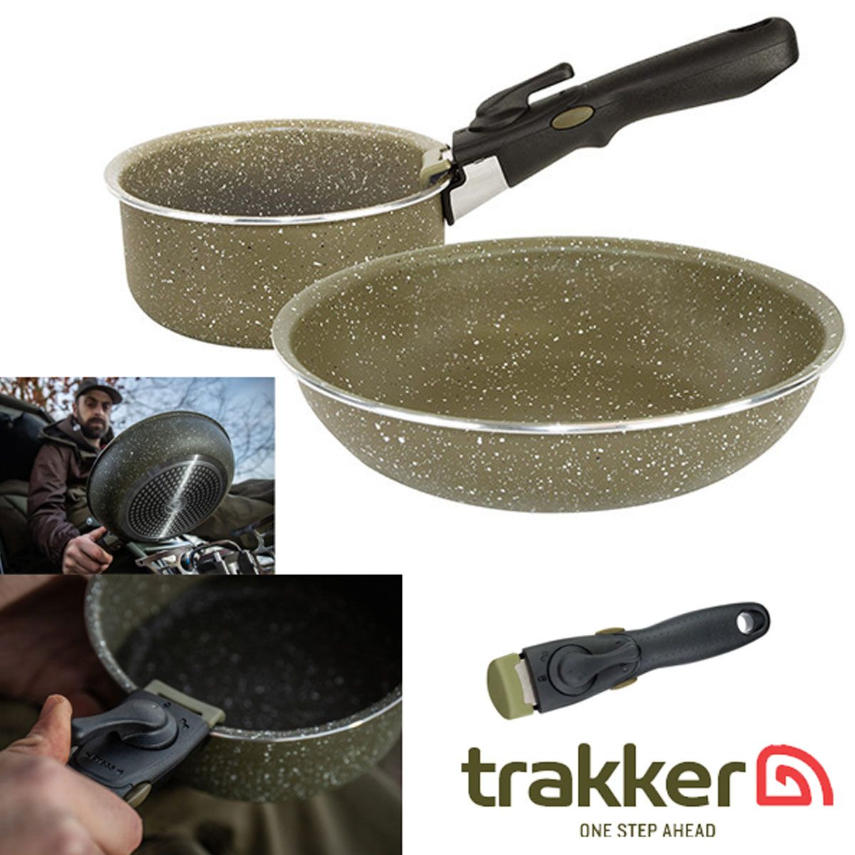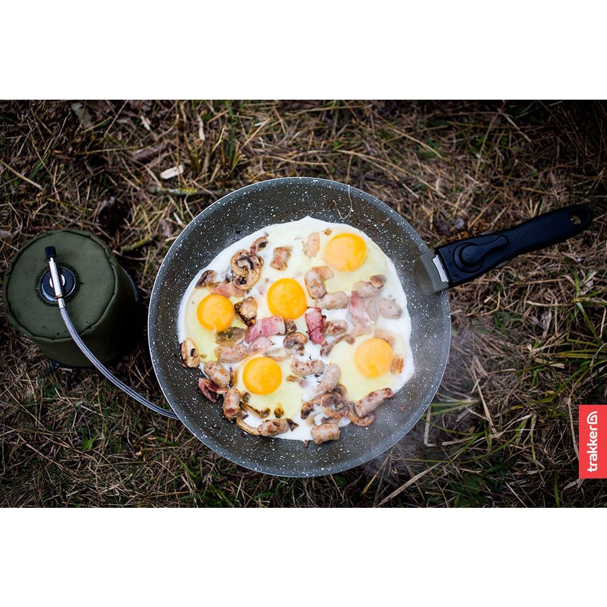 La base de acero inoxidable con el logotipo Trakker en relieve permite utilizar el set en múltiples fuentes de calor, incluidas cocinas de gas, radiales, cerámicas, halógenas e incluso de inducción, ofreciendo máxima versatilidad.