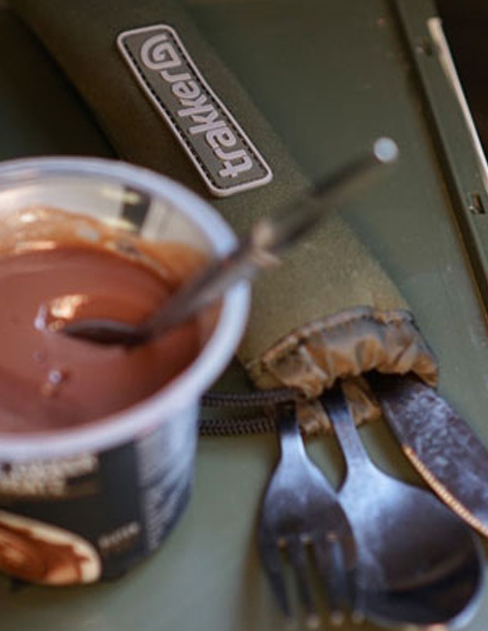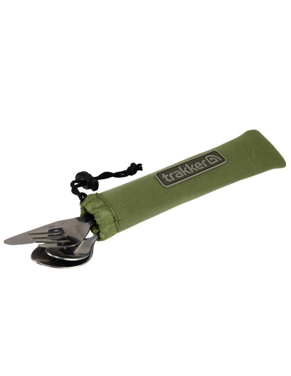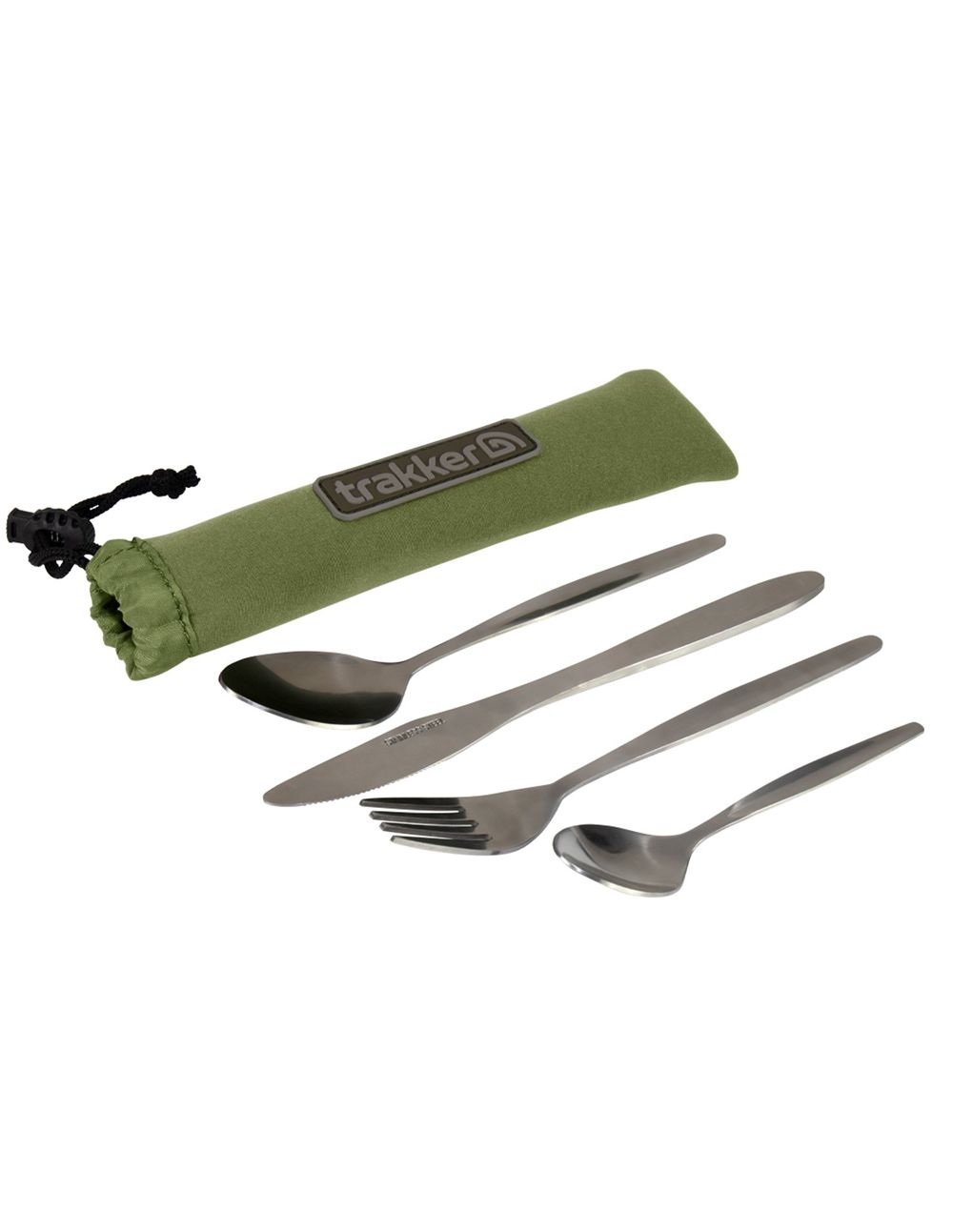 El juego de cubiertos Trakker Armolife es compacto y manejable y consta de un juego de cuatro piezas con cuchillo, tenedor, cucharada y cucharilla de acero inoxidable, todo ello suministrado en una práctica funda protectora de neopreno para guardarlo fácilmente.