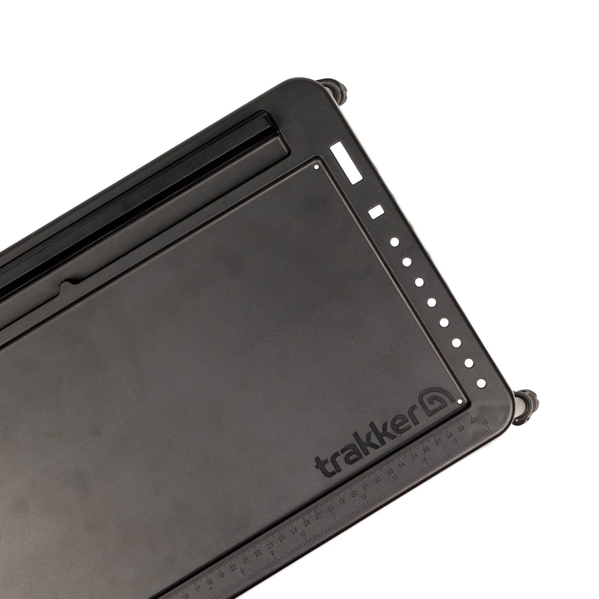 Uno de sus elementos más prácticos es su superficie con diseño rebajado (recessed), que ayuda a evitar que objetos pequeños como anzuelos, eslabones o agujas de montaje se deslicen o caigan accidentalmente. Esta característica convierte la mesa en una superficie segura para trabajar con montajes delicados o preparar PVA bags sin preocupaciones.