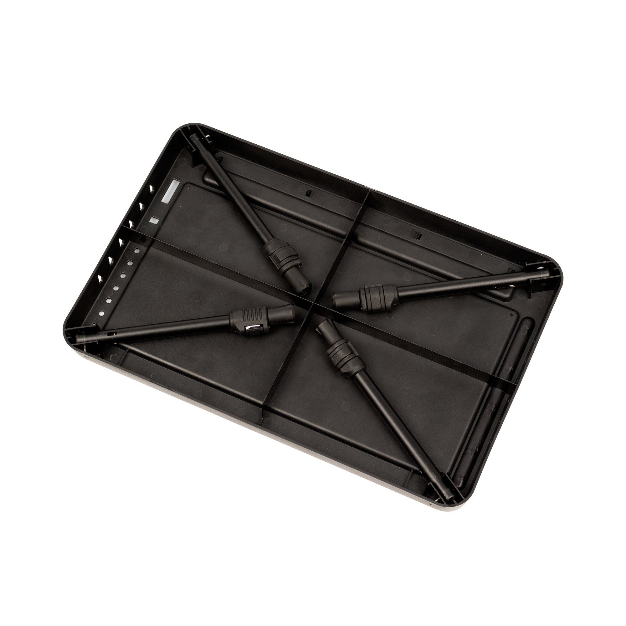 El diseño del Deluxe Bivvy Table está pensado para la máxima eficiencia. Incluye zonas específicas para herramientas de montaje, espacios para almacenar rigs ya preparados y áreas laterales para mantener el material ordenado. Todo está distribuido de forma que puedas trabajar rápidamente sin perder tiempo buscando accesorios en bolsas o cajas.