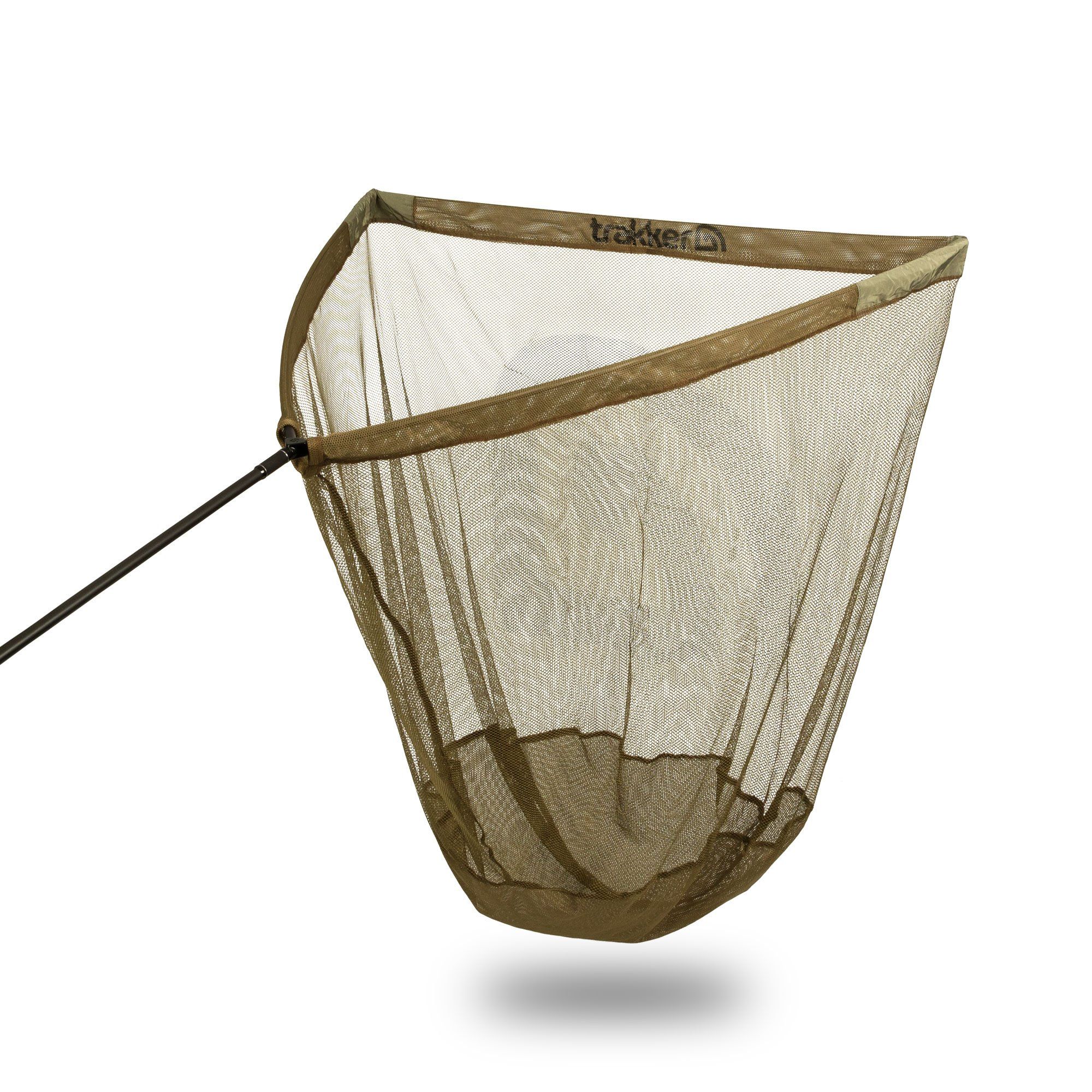El saco de la red está confeccionado con malla suave extra‑profunda reforzada, en un tono oliva discreto con el logo de Trakker bien visible. Esta malla no solo protege al pez durante la maniobra, sino que facilita un manejo más seguro y eficaz de capturas grandes sin causarles estrés o daños innecesarios.