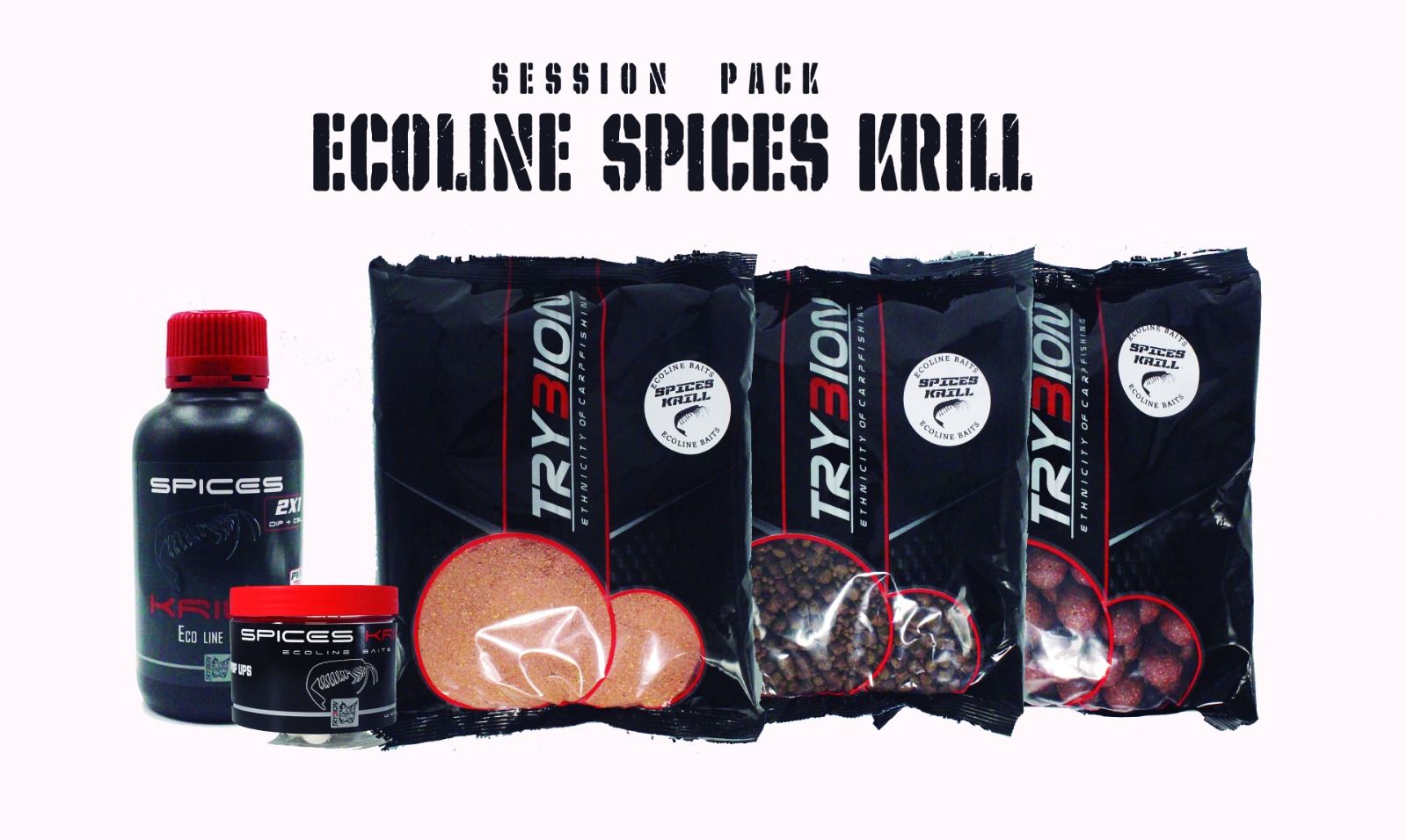 El Trybion Ecoline Session Pack Spices Krill es una solución integral de cebos diseñados para cubrir todas las necesidades de una sesión de pesca de carpas, desde el cebado del spot hasta la presentación directa sobre el anzuelo. Forma parte de la gama Ecoline de Trybion, enfocada en productos con ingredientes de alta calidad que equilibran potencia de atracción con respeto por el entorno acuático.