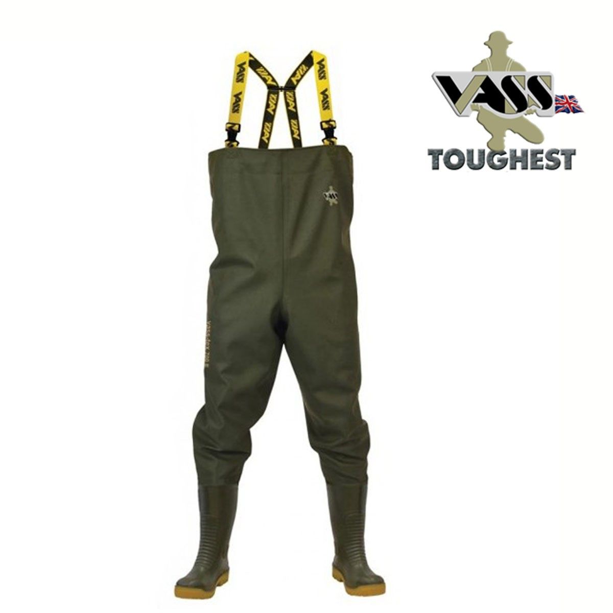 Fabricado con el exclusivo material Vass-Tex 700 de alta resistencia, este vadeador incorpora una estructura bi-elástica que proporciona mayor flexibilidad, durabilidad y confort prolongado. Su acabado exterior de PVC liso ofrece una excelente resistencia al agua y a la abrasión, mientras que el reverso de poliéster suave actúa como amortiguador de las costuras, aumentando la vida útil del conjunto.